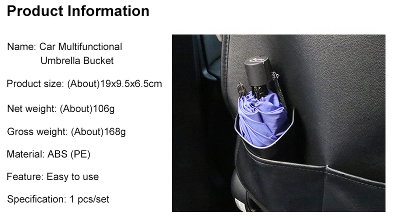 --This bucket not only can put an umbrella but also can put other small sundries, also is very suitable as a small garbage can.--It can be conveniently hung on the back of the car seat, and can be placed the umbrella barrel in front of the car or on the side window.Notes: