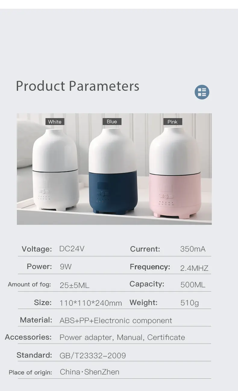 -100% абсолютно новый и высококачественный-тихий и непрерывный режим работы не будет мешать вашей работе, сну и-рассеивающий туман на протяжении всего вашего жилого пространства и повышает влажность кожи пространства. -Модный дизайн, экологически чистый и тихий шепот-быстрое увлажнение и очистка воздуха, снижение статического электричества-Применение: домашний офис гостиная спальня и т. д. Материал: ABS/PP/силикон Номинальное напряжение: DC24V Рабочая Ток: 350 мА мощность: 9 Вт Емкость резервуара для воды: 500 мл частота: 2,4 МГц Количество тумана: 35 мл/ч Вес: 510 г размер изделия: 110*110*240 мм цвет изделия: аксессуары: белый, розовый, темно-синий Адаптер, руководство, сертификат