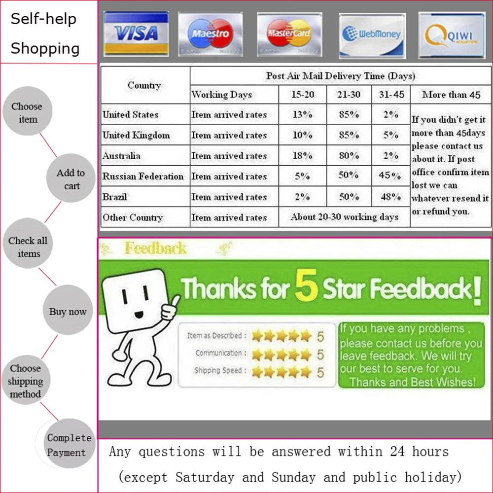 По любым вопросам, пожалуйста, свяжитесь с нами через aliexpress сообщение, мы постараемся ответить на все электронные письма в течение 24 часов. Однако в выходные и праздничные дни не будет отвечено ни одно электронное письмо. Пожалуйста, учитывайте до 48 часов задержки в получении нашего ответа после долгих выходных или праздничных дней