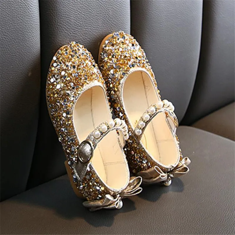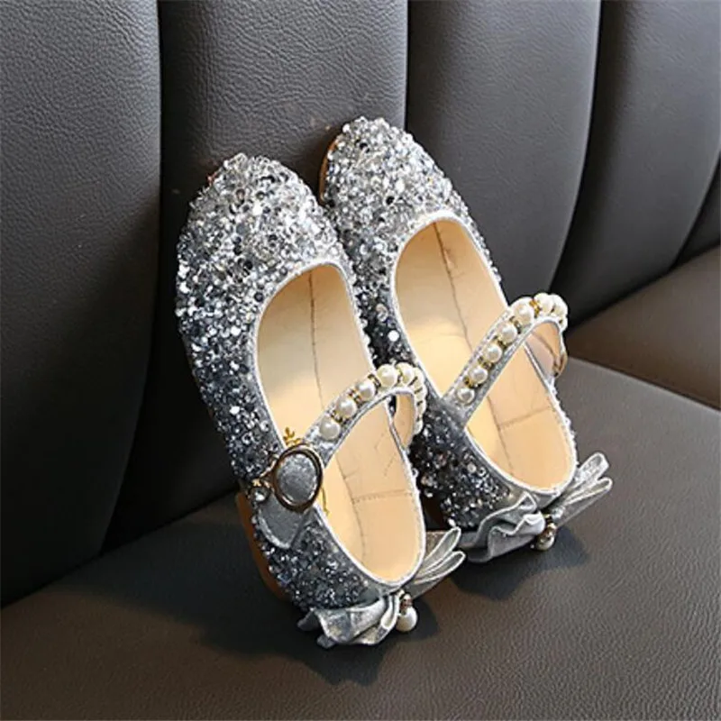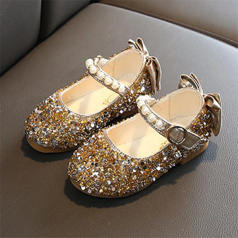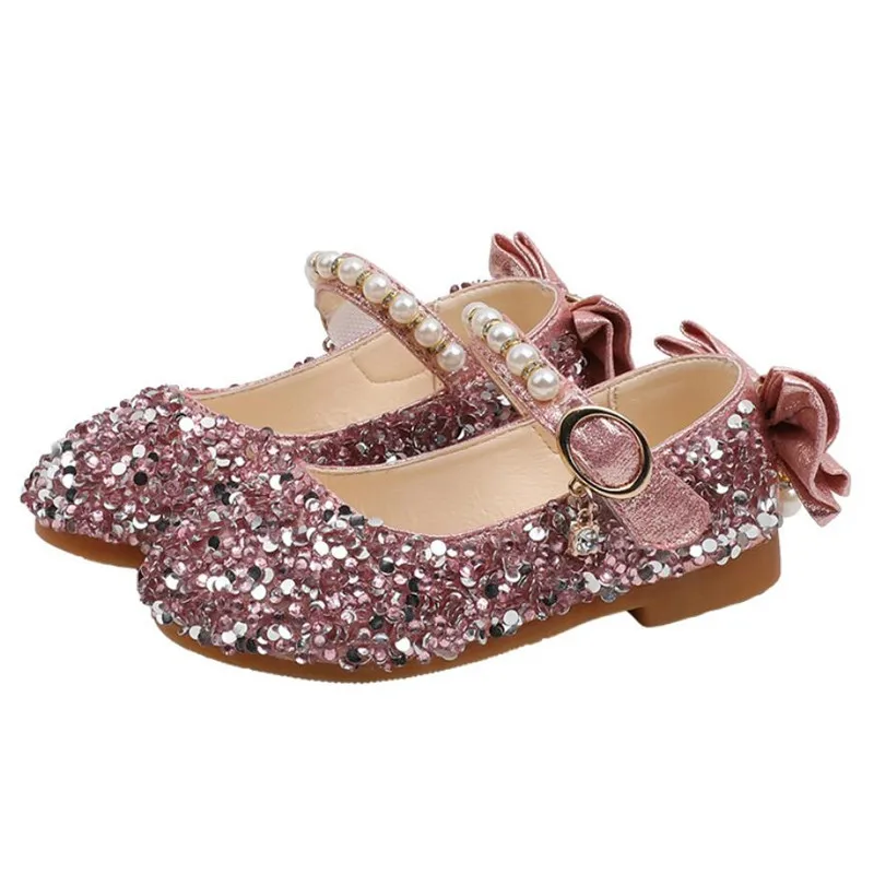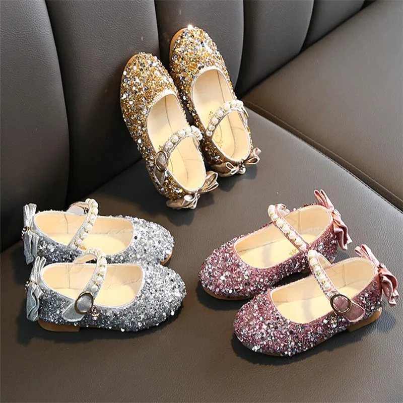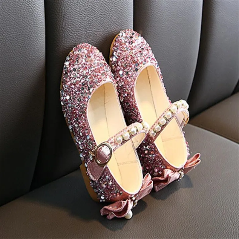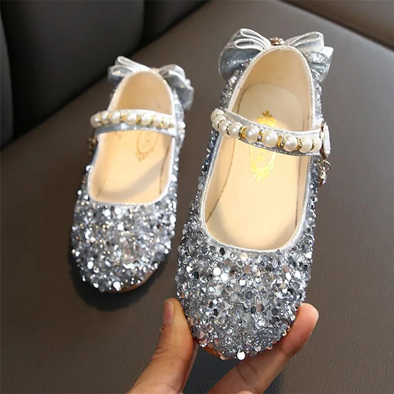 Кожаная обувь для девочек; Модная детская повседневная обувь с блестками; Сезон весна-осень; Блестящие вечерние свадебные туфли для детей; Обувь принцессы на плоской подошве с бантом