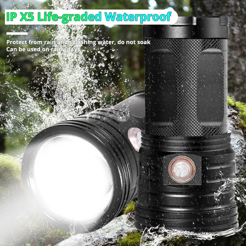Водонепроницаемый диапазон IPX 5 может защитить его от брызг воды со всех сторон. Он подходит для наружной среды, неблагоприятных погодных условий. Этот мощный фонарик изготовлен из высококачественного водонепроницаемого и ударопрочного алюминиевого сплава, что делает его прочным, прочным и долговечным, легким для рассеивания тепла.