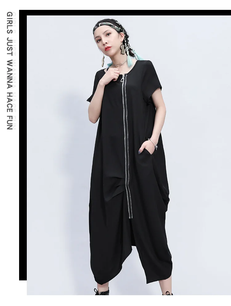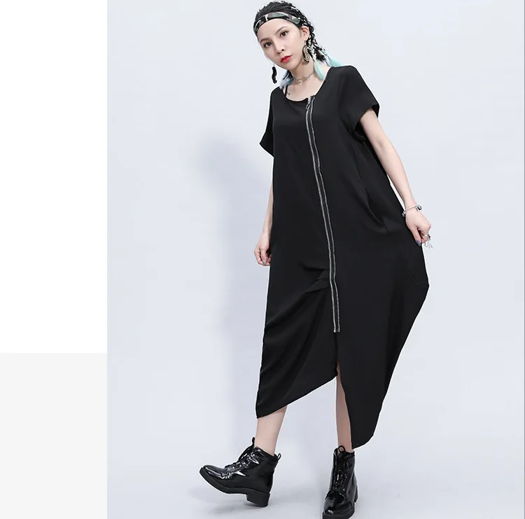 Женское летнее платье, хит продаж 2020, с коротким рукавом, готическое, черное, повседневное, плюс размер, свободное, длинное платье, рубашка, с неровным подолом, Япония, Харадзюку, с длинным украшением на молнии