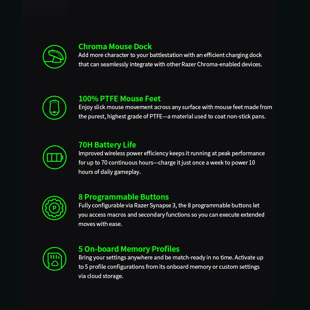 Имеет 16,8 миллионов цветовых комбинаций с эффективной зарядной док-станцией, которая может легко интегрироваться с другими устройствами с поддержкой Razer Chroma, И улучшенная эффективность беспроводной мощности позволяет ему работать на пике производительности до 70 непрерывных часов-заряжайте его всего один раз в неделю, чтобы заряжать 10 часов ежедневного игрового процесса.