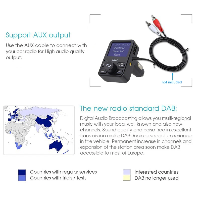 Эта DAB антенна может быть установлена внутри ветрового стекла, что позволяет подключаться непосредственно к вашему устройству DAB. CD качество звука и отсутствие шума в отличной передаче делают DAB Radio особенным опытом в транспортном средстве. Постоянное увеличение каналов и расширение площади станции в скором времени делают DAB доступным для большинства стран Европы. Особенности: * Цифровое аудио-вещание (DAB) предлагает вам многосегиональную музыку с вашими известными и новыми каналами. * Используя fm-передачу для звукового выхода, вы также можете наслаждаться DAB + Радио даже ваше автомобильное радио без функции DAB +. * CD-качество звука и отсутствие шума в отличной передаче, что делает радио DAB широко доступным для большинства стран Европы. * С функцией Bluetooth вам будет удобнее и безопаснее отвечать на телефонные звонки или слушать музыку BT во время вождения. * Используйте кабель AUX для подключения к вашему автомобильному радио для высокого качества звука. Примечание: Подходит только для стран, у которых есть DAB сигнал: Австралия, Бельгия, Чехия, Дания, Франция, Германия, Gibraltar, Гонконг, Ирландия, Италия, Kuwait, Malta, Monaco, Netherlands, норвегия, Польша, Словения, Корея, Испания, Швеция, Швейцария, Великобритания. Модель: DAB-008 Рабочее напряжение: + 5 В (Typ) Рабочий ток: 60 мА Диапазон рабочих температур: от-20 до 70 ℃ Диапазон приема частот: диапазон III: 170 МГц-215 МГц Язык: английский, датский, норвежский, немецкий, нидерландский, итальянский, французский, шведский, финский Цвет: черный Основной Размер товара: 8,7*8,4*1,8 см/3,42*3,30*0,70 дюймов Основной вес изделия: 86 г/3,05 унций Посылка Размеры: 17,3*13,5*5,2 см/6,81*5,31 * 2.04in Вес посылка: 268 г/9,46 унций Посылка: 1 * DAB + коробка 1 * DAB антенна 1 * USB кабель 1 * av-кабель 1 * Руководство пользователя на английском/немецком языках