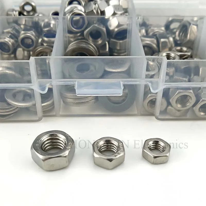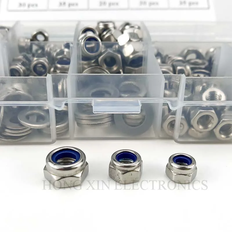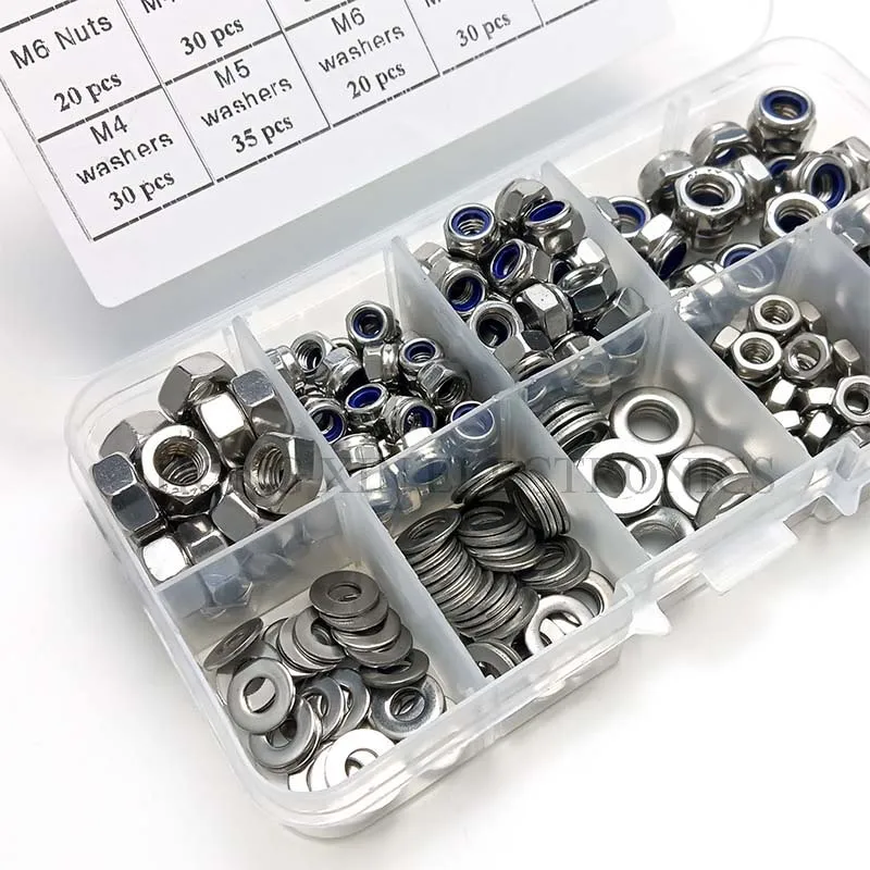 Плоская шайба 30xM4 Плоская шайба 35xM5 Плоская шайба 20xM6 Гайка 30xM4 Гайка 35xM5 Гайка 20xM6 Фиксирующая гайка 30xM4 35xM5 Стопорная гайка 20xM6 Стопорная гайка 1 пластиковая коробка