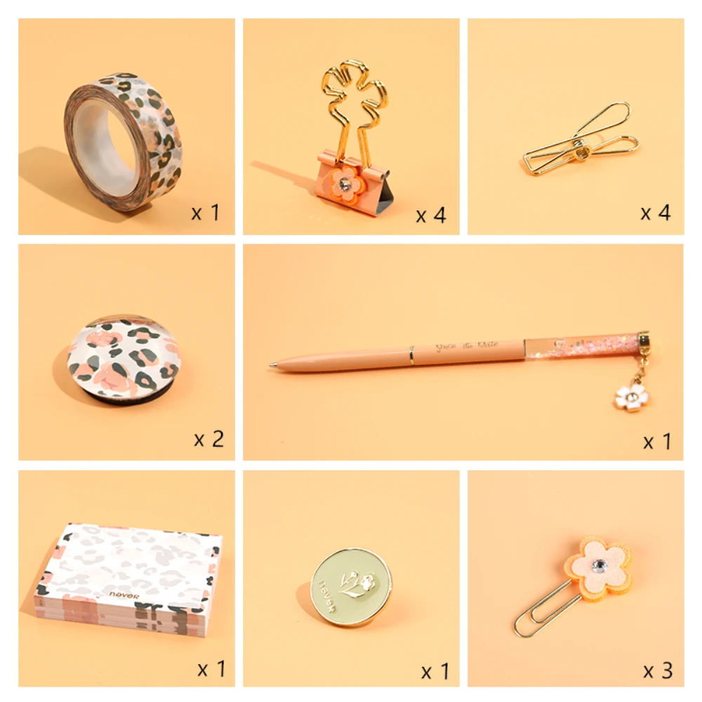 1 шт. прозрачная акриловая коробка, 1 шт. шариковая ручка, 2 шт. магниты на холодильник, 4 шт. маленькие зажимы; 4 шт. скрепки, 1 рулон васи ленты, 1 шт. нагрудник, 3 бумажных зажима и 1 куб для блокнота.