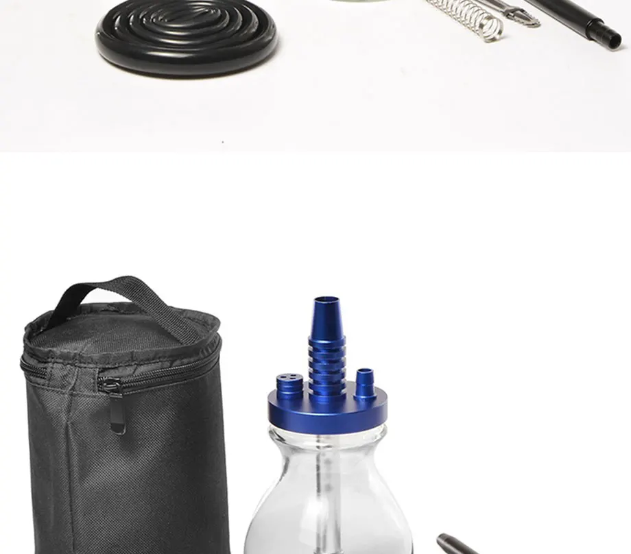 Информация о продукте Проект: Дорожная сумка для кальяна Материал: стекло Цвет: черный, синий, серебристый Общая высота: около 21 см/8,27 дюйма Диаметр дна: около 10 см/3,94 дюйма Применение: водопроводные трубы и аксессуары Применимые места: для дома, бара, ночного клуба, свадьбы, вечерние, путешествия, улицы Упаковочный лист: 1 шт. * основа для кальяна (включая необходимые аксессуары, показанные на картинке) 1 * кальян 1 шт. * силиконовая трубка (включая алюминиевый стержень) 1 шт. * Металлический уголь пинцет 1 * металлическая пружина