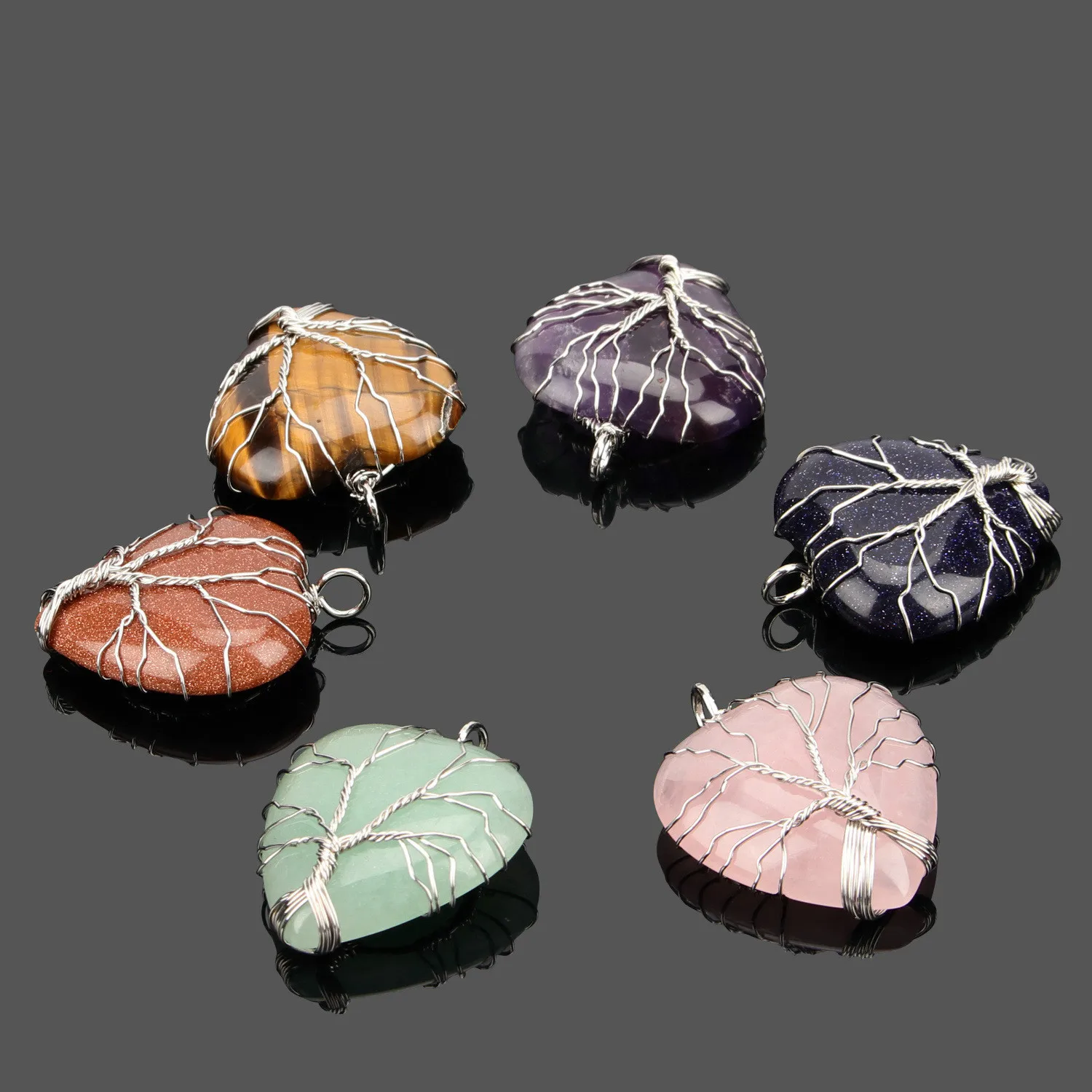 Натуральный кристалл драгоценный камень ручная рана в форме сердца подвеска с деревом жизни ювелирные изделия DIY ожерелье браслет серьги ювелирные изделия аксессуары