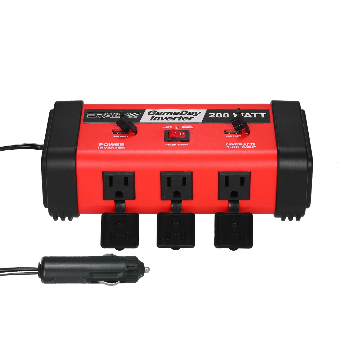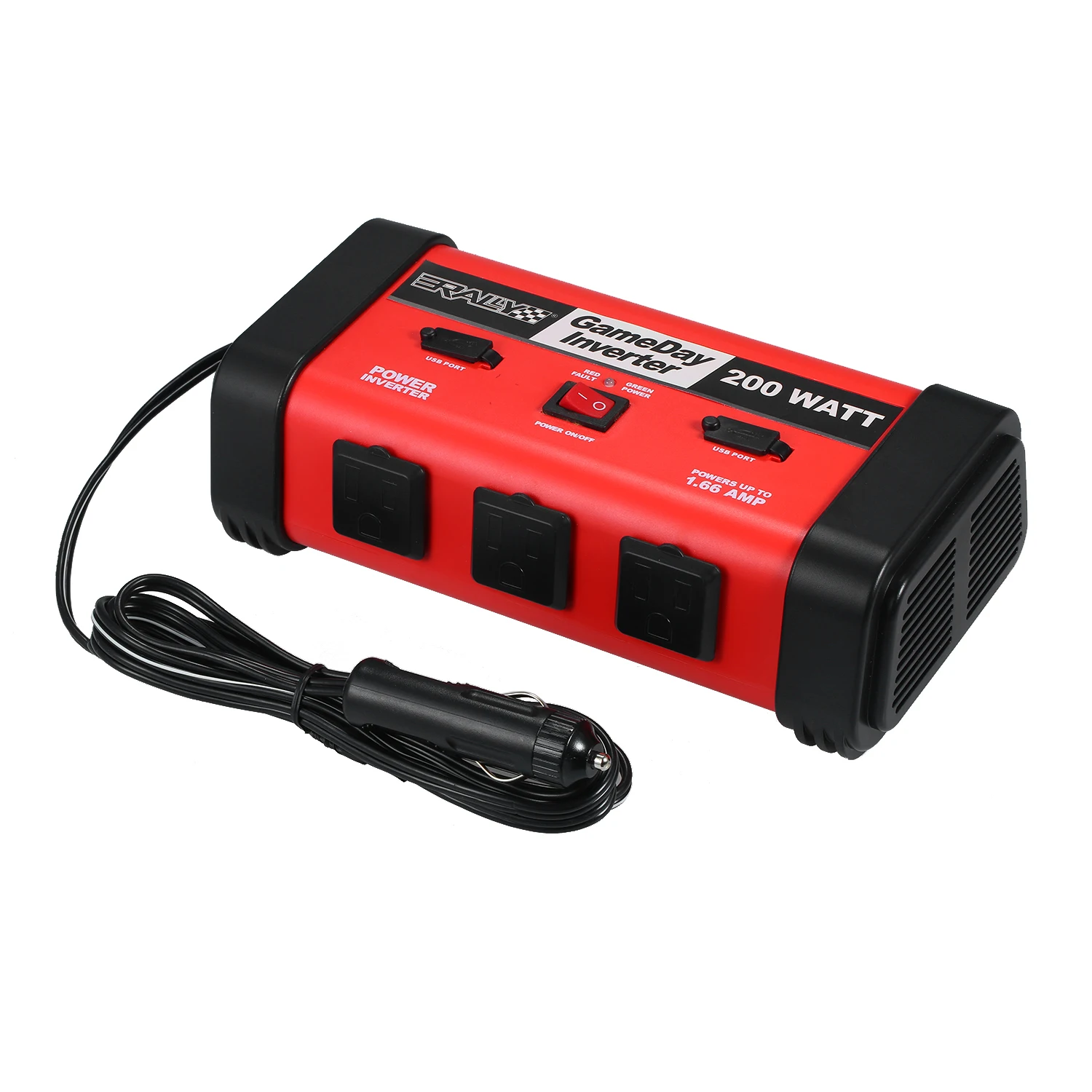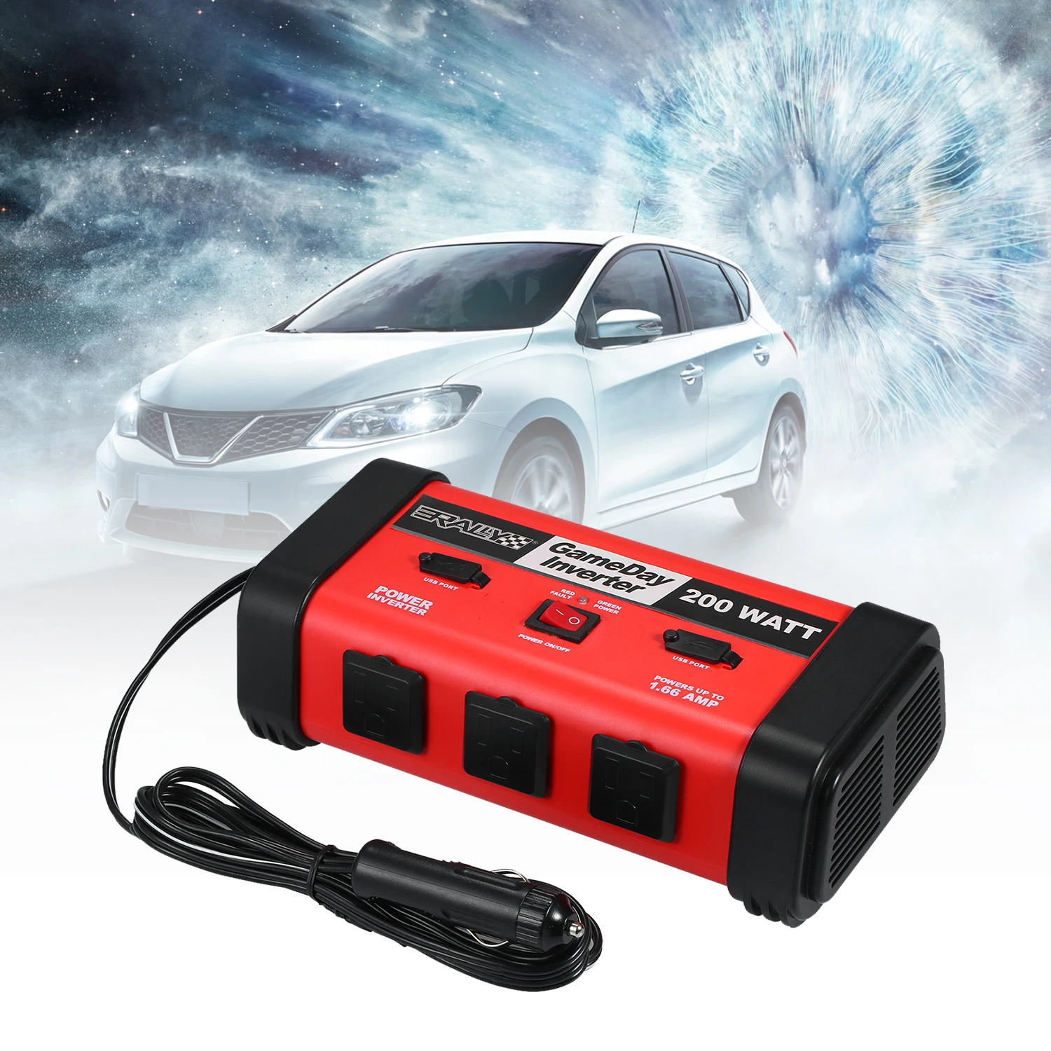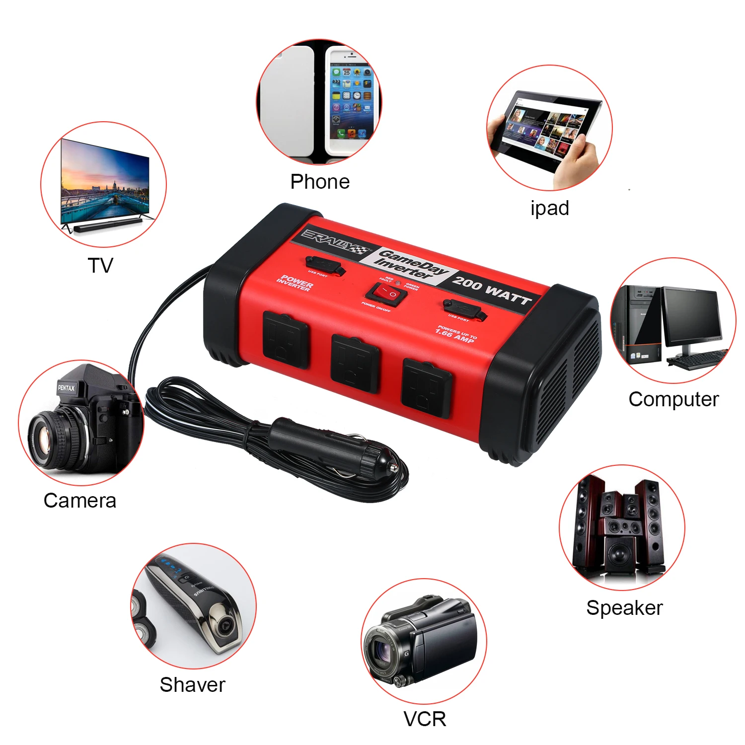 200 Вт инвертор высокой мощности --- поставляется с профессиональной прикуривателем. Обеспечивает 200 ватт непрерывной мощности, преобразует 12 В постоянного тока батареи в стандартный 110 В переменного тока.