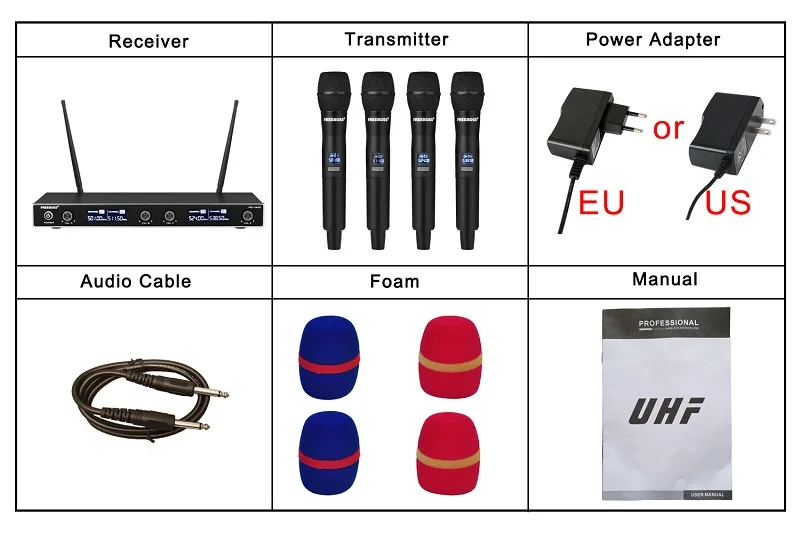 1. Пункт продажи:1) фиксированная частота диапазона УВЧ2) Передатчик: 4 шт. пластиковые ручные микрофоны3) Приемник:A) металлическая коробка, кнопка вкл/выкл, RF индикаторB) Индивидуальные регуляторы громкости на каждом канале4) четыре отдельных выхода XLR и один смешанный выход 1/4 ".5) диапазон: до 98 футов (более 30 метров), подходит для караоке, выступлений, вечерние, церковные и т. Д.6) Батарея: 4*2*1,5 АА (не входит в посылка.)7) Срок службы батареи:>6 часов