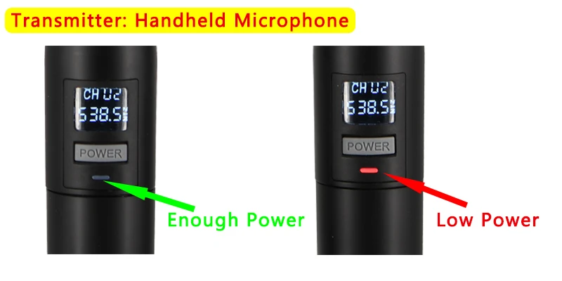 5. Передатчик:Капсула: Профессиональное аудио динамическое CapsulМощность передачи:<= 10dbmСтабилизация частоты: +-0.005%Батарея комплект из двух предметов, Батарея 1,5Материал:Пластиковый ручной, удобный и плавный опыт работы с элегантным внешним видом.Картридж:1) Тип: подвижная катушка2) Полярный узор: кардиоид
