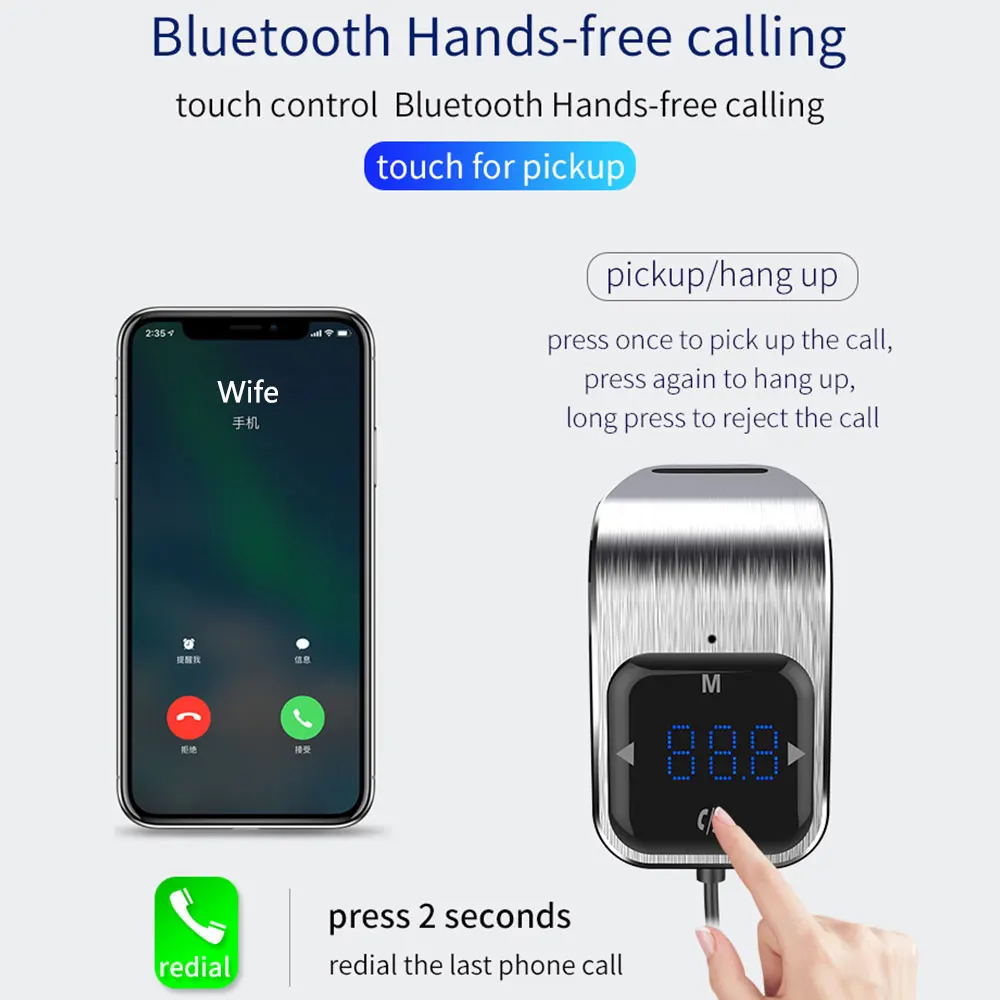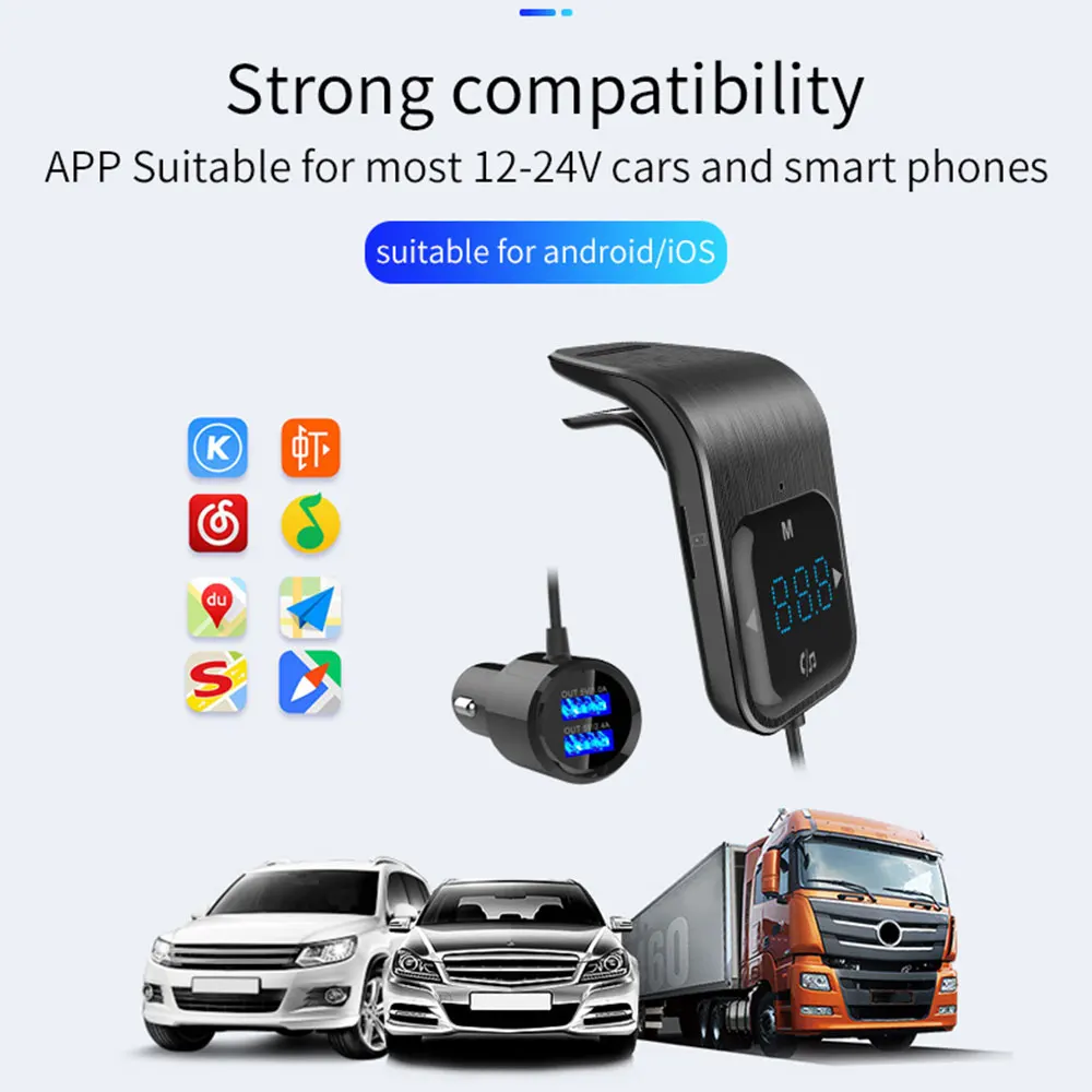 -Bluetooth ответ, зависание, отклонение, повторный вызов и другие функции -Поддержка воспроизведения стерео музыки Bluetooth -Светодиодный дисплей -Поддержка обнаружения напряжения аккумулятора автомобиля -Поддержка воспроизведения музыки с tf-картой (1G-32G) -Поддержка MP3 / WMA формат музыки -Поддержка FM полночастотной функции передачи 87,5-108,0 МГц -Функция автоматического отключения памяти -USB1 поддерживает выход 5 В/1 А -USB2 поддерживает выход 5 В/2,4 А -Поддержка голосовых подсказок для навигации по телефону -Поддержка идентификации заряда -Сенсорные кнопки -Автомобильный fm-передатчик, Bluetooth hands-free, автомобильное зарядное устройство, mp3-плеер