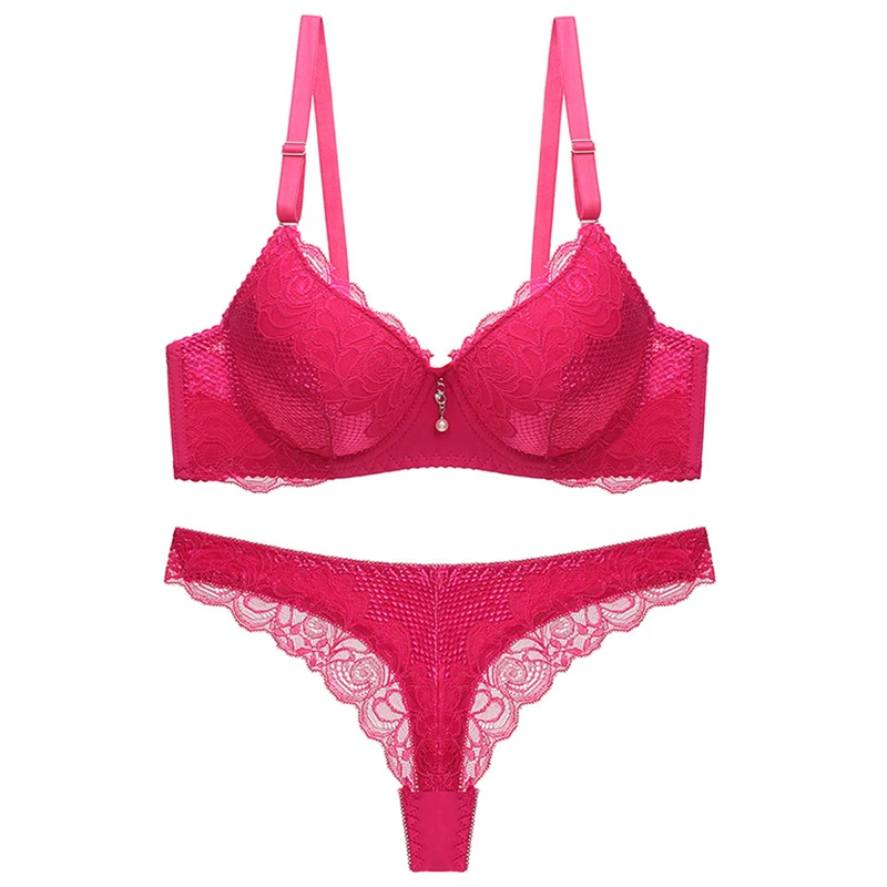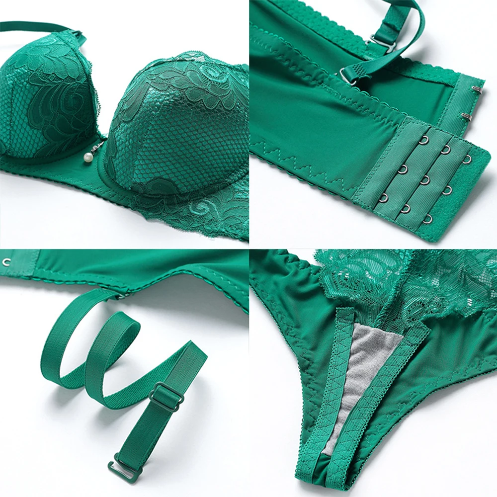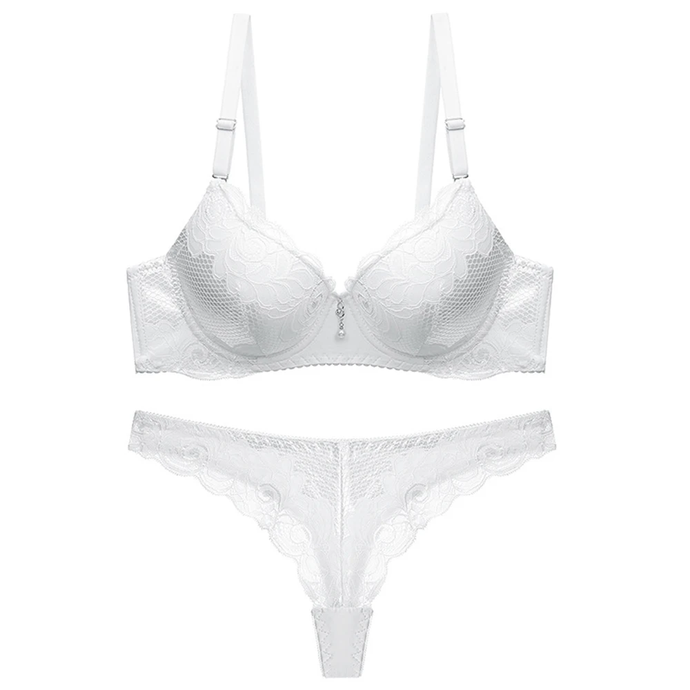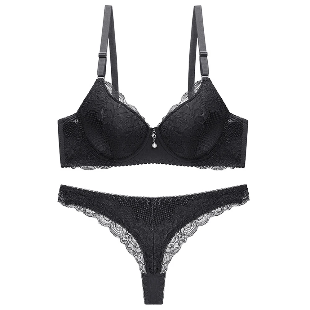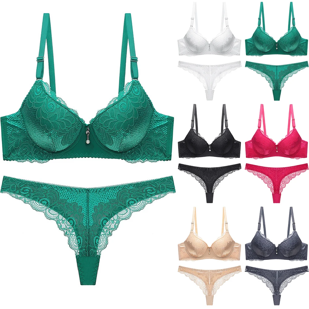 Стринги, Женский комплект с бюстгальтером, кружевной комплект с пуш-ап бюстгальтером и трусиками, однотонное нижнее белье