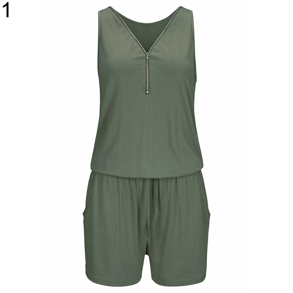 Особенности: пляжный комбинезон, приталенный, однотонный, v-образный вырез на молнии, без рукавов, два боковых кармана, эластичная резинка на талии, шорты, сексуальный