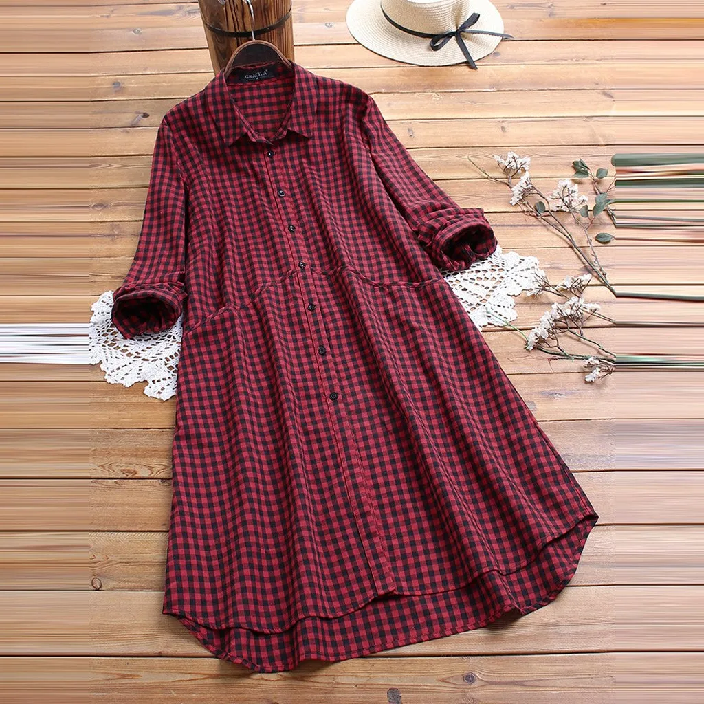 Женская мода лацканы сплошной цвет плед печати длинныйМини-платье с длинными рукавами