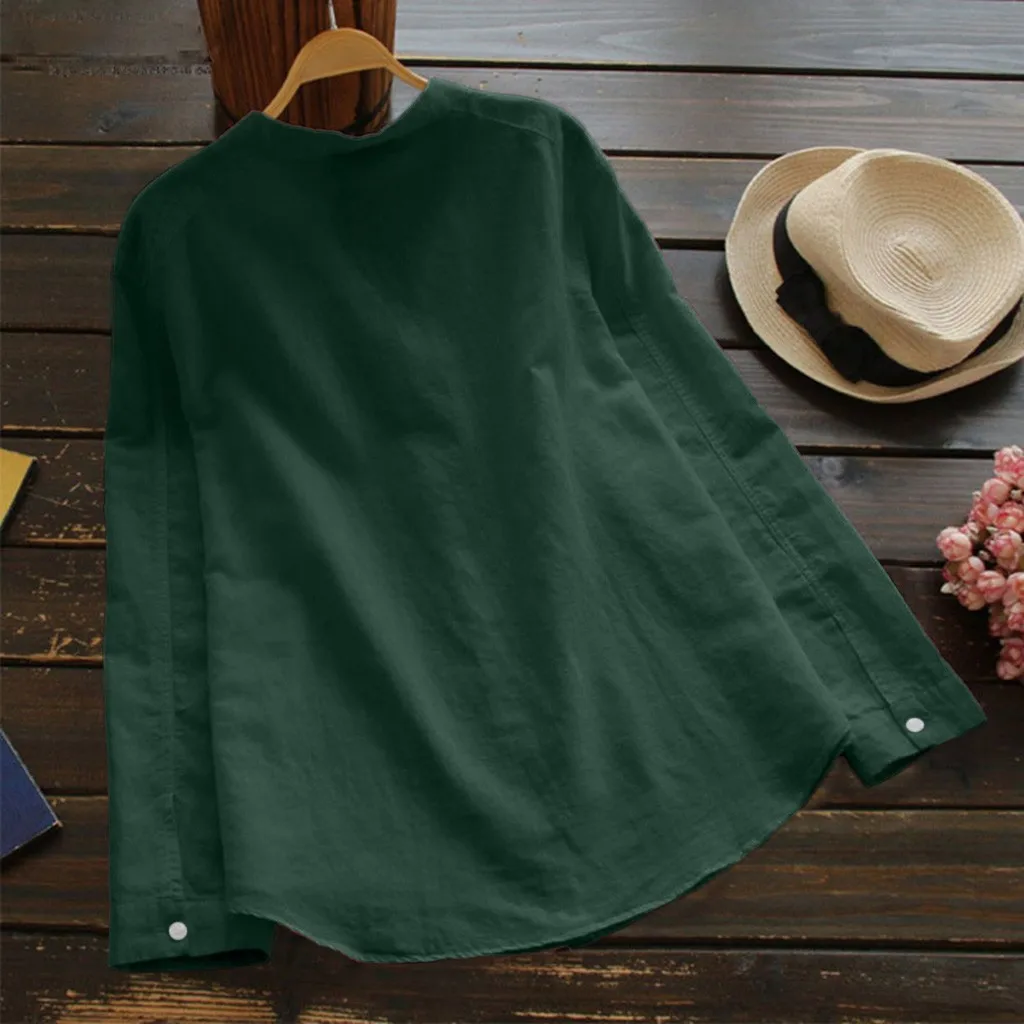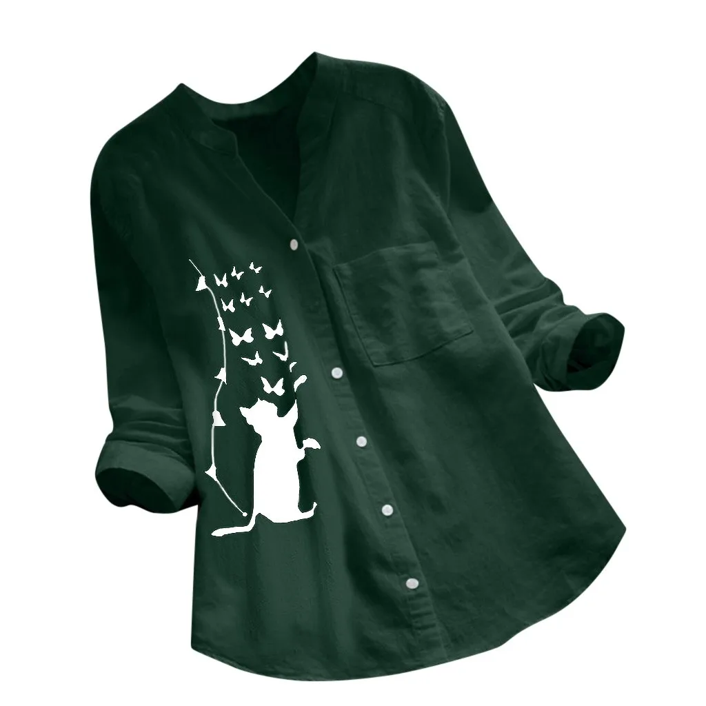 Женские блузки из хлопка и льна с принтом кота из мультфильма, с карманами и длинными рукавами, на пуговицах, топы, Женская милая блузка, Chemisier Femme