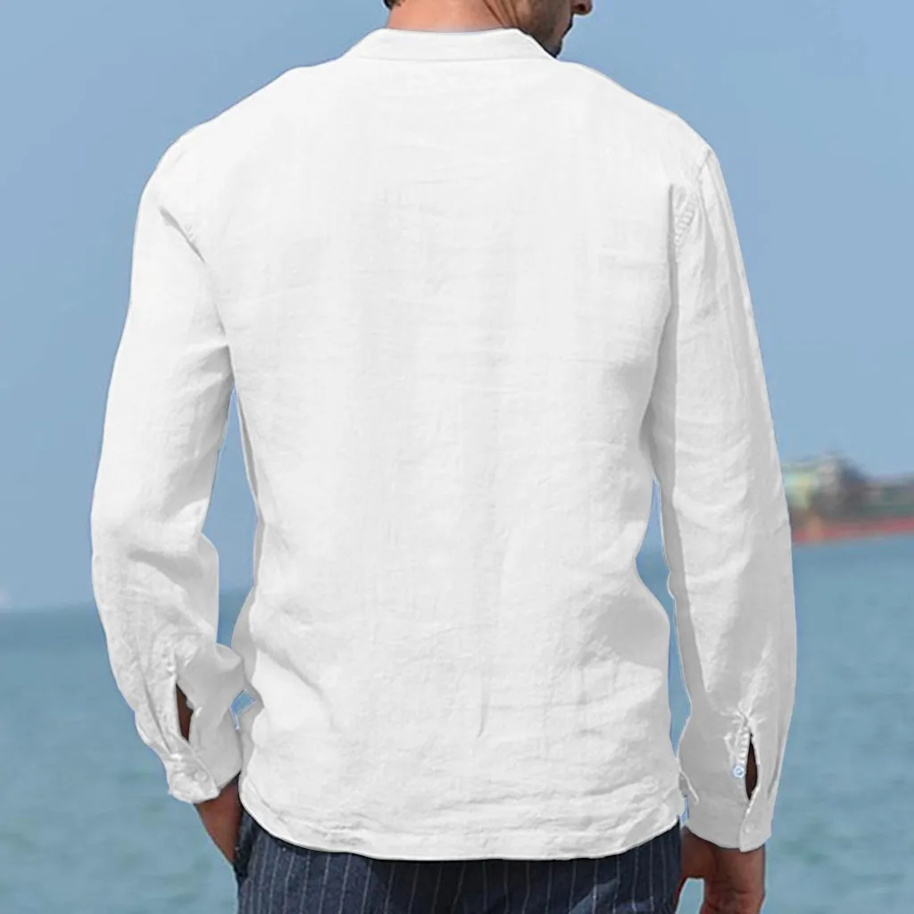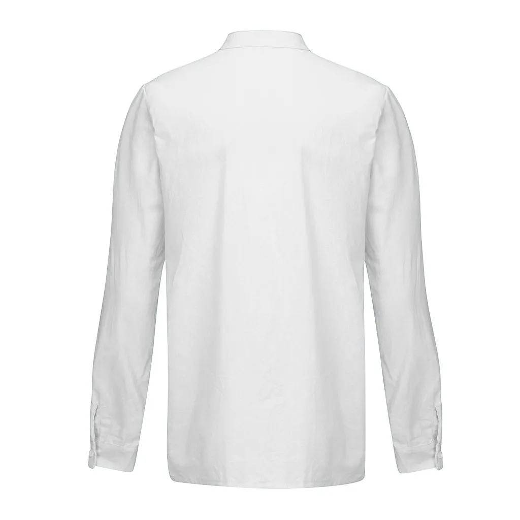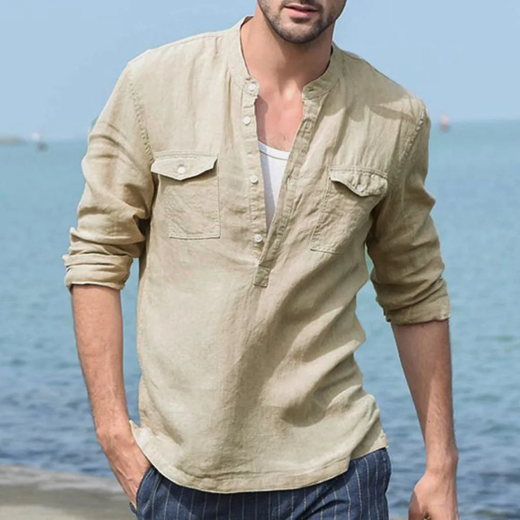 Мужские Мешковатые хлопковые льняные однотонные футболки с карманами и длинными рукавами в стиле ретро, топы, блузки