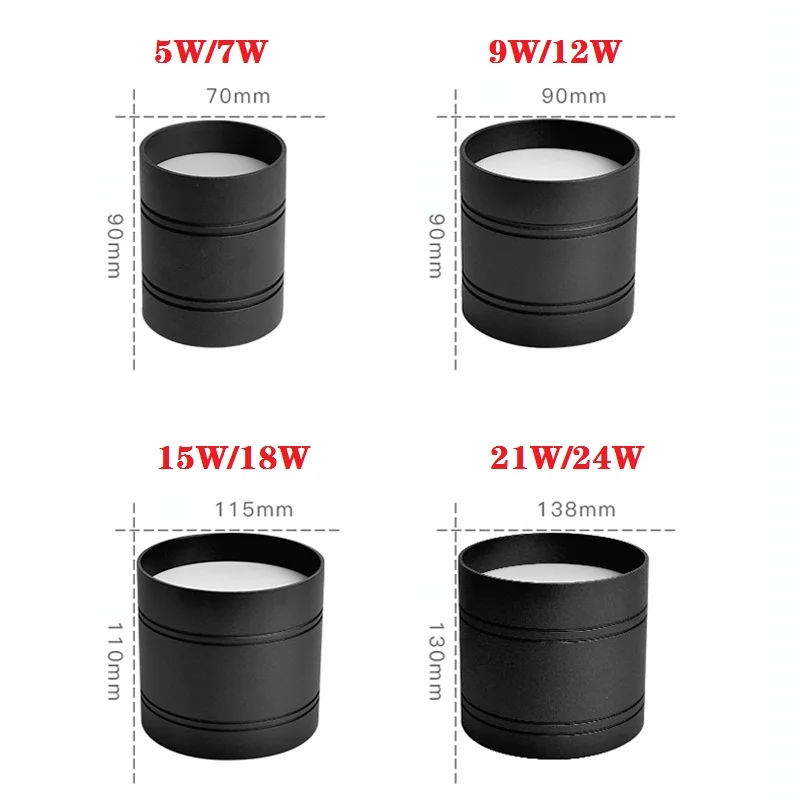 5 Вт/7 Вт: Φ70мм * 90 мм 9 Вт/12 Вт: Φ90 мм * 90 мм 15 Вт/18 Вт: Φ115 мм * 110 мм 21 Вт/24 Вт: Φ138мм * 130 мм