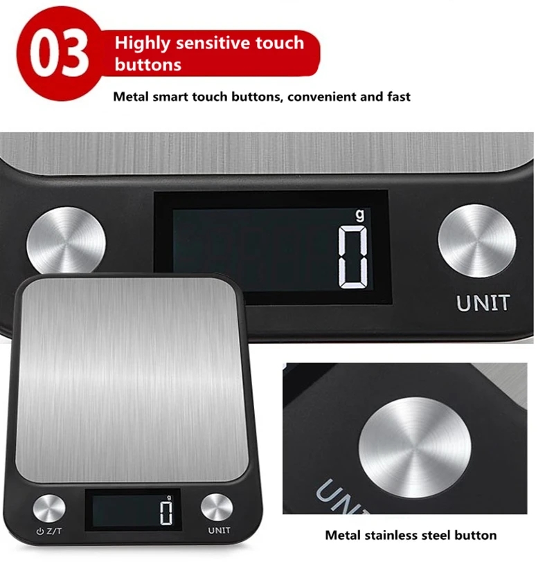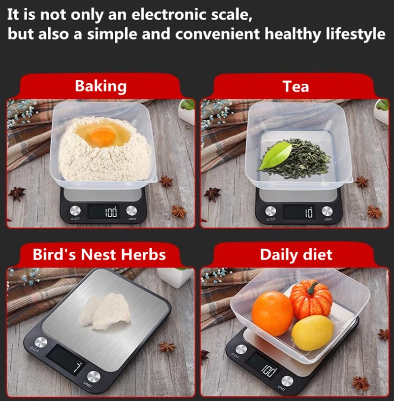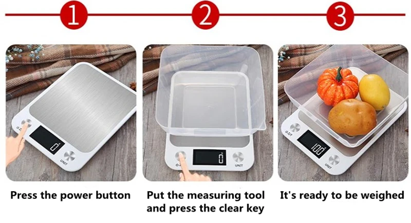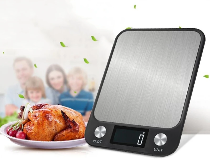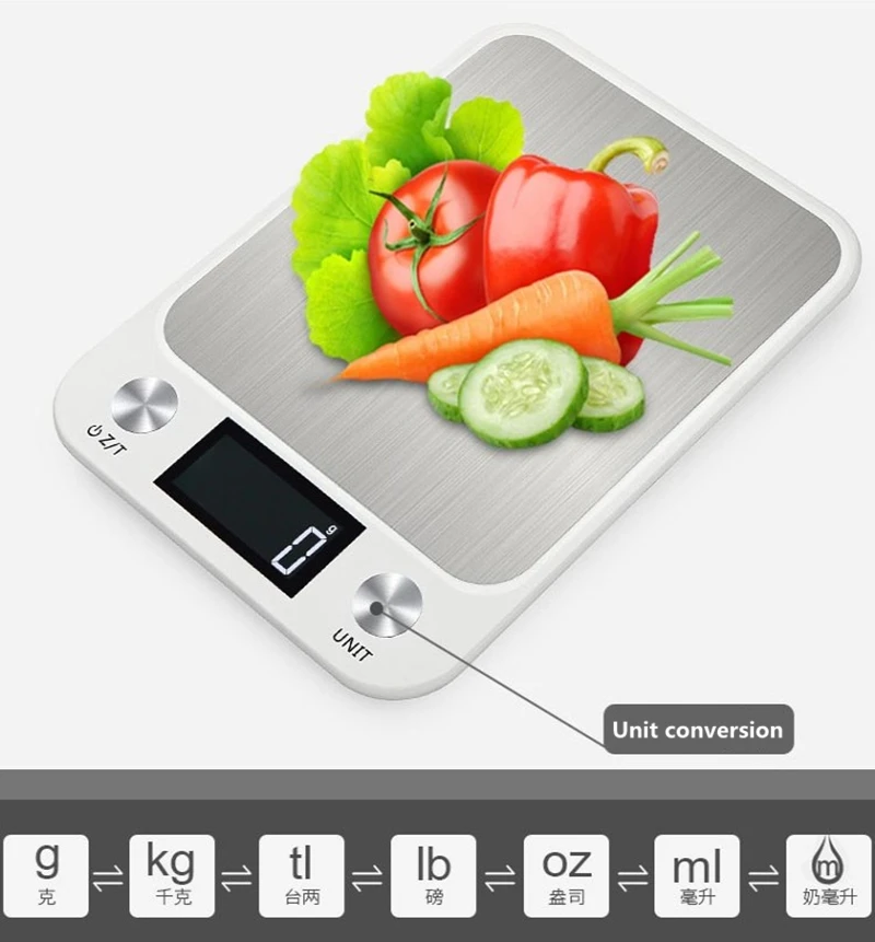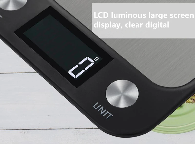 Название продукта: кухонные весы Материал изделия: нержавеющая сталь и АБС-пластик Цвет изделия: белый, черный Размер продукта: 225x165x19mm Размер зоны взвешивания: 175x152мм Вес изделия: 335 г Диапазон измерения: 3g-5000g, 3g-10000g, 3g-15000g Точность: 1 г Мощность: 2 аккумулятора xAAA Единицы измерения: G, KG, LB, OZ, TL, ML, MILK ML Особенности: Поверхность для взвешивания из нержавеющей стали является водонепроницаемой и прочной, легко моется, ЖК-дисплей высокой четкости и семь типов преобразования единиц. Посылка в комплект входит: 1 х Кухонные весы (без батареи)