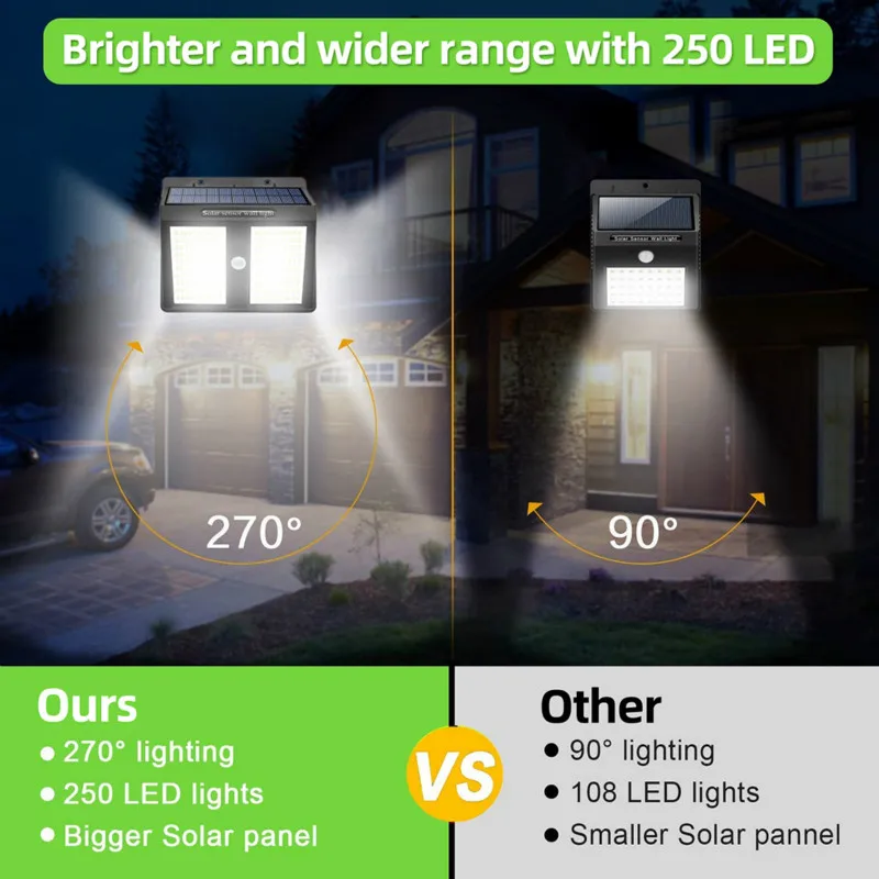 Используя экспрессивный широкоугольный дизайн освещения, диапазон освещения может быть улучшен до 270 °. Это значит, что в связи с тем, что охват области базового 100/146/250 светодиодный почти в три раза больше, чем другие фонари на солнечных батареях