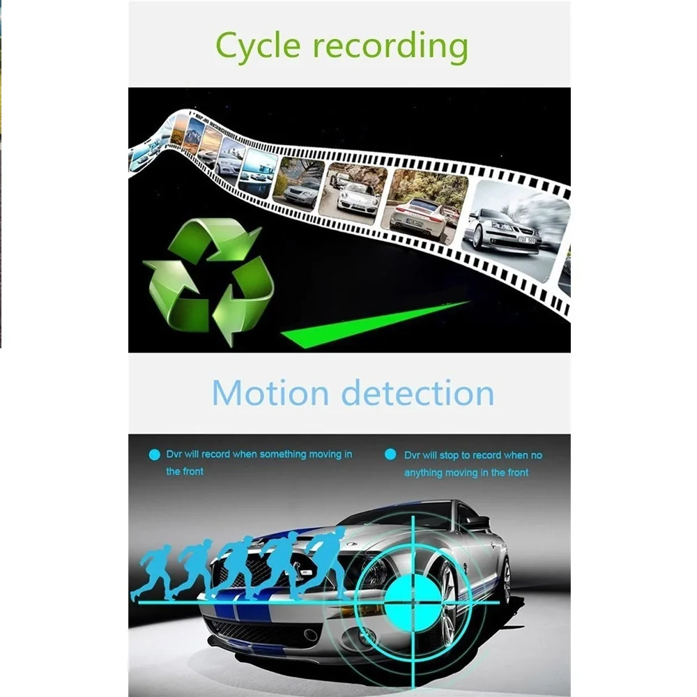 1080P Full HD высокой четкости с чрезвычайно широким углом 170 градусов, который может захватывать номерные знаки автомобилей, дорожных знаков и других вещей в ночное видение как можно более ясно. Блокировка и автоматическое обнаружение движения, при столкновении, резких тормозах и других чрезвычайных ситуациях система автоматически блокирует файлы, тем самым сохраняя важные видеофайлы. Этот автомобильный видеорегистратор имеет две камеры, которые могут записывать два разных угла видео одновременно. Когда автомобиль переворачивает механизм, Автомобильный видеорегистратор автоматически переключается на изображение альтернативной камеры с линией парковки. 4 дюйма IPS сенсорный экран HD дисплей экран высокой четкости, полная система управления цветом.