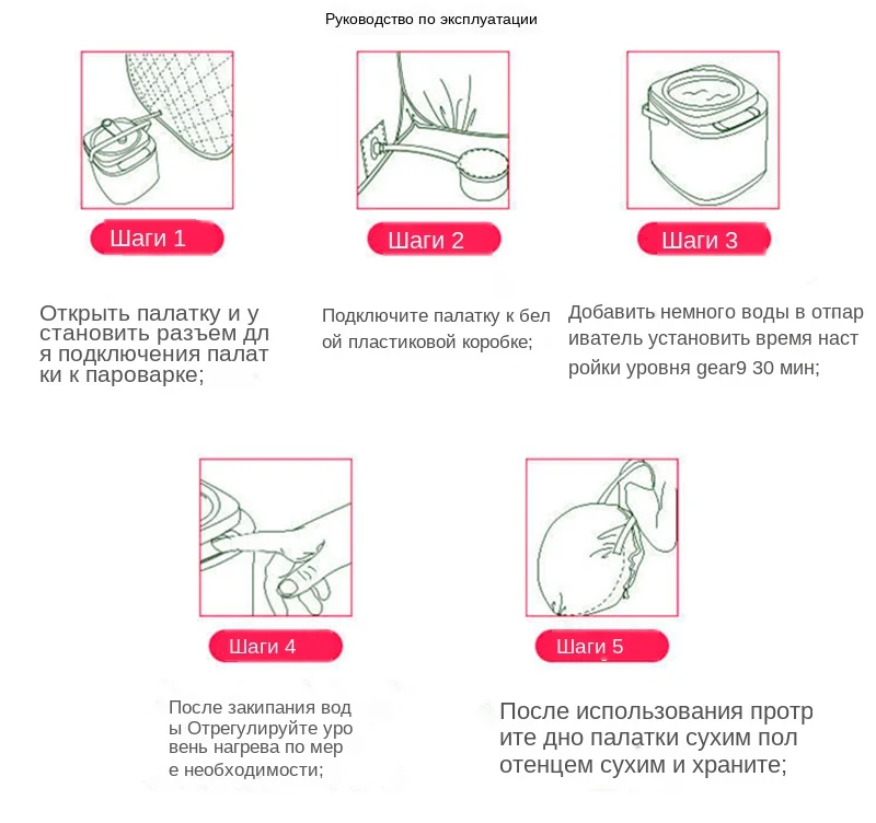 1 x парогенератор 1 x сауна-палатка 1 x коробка для трав 1 х пульт дистанционного Управление 2 х шланги 1 х разъем На английском языке (1 шт.) Instructios