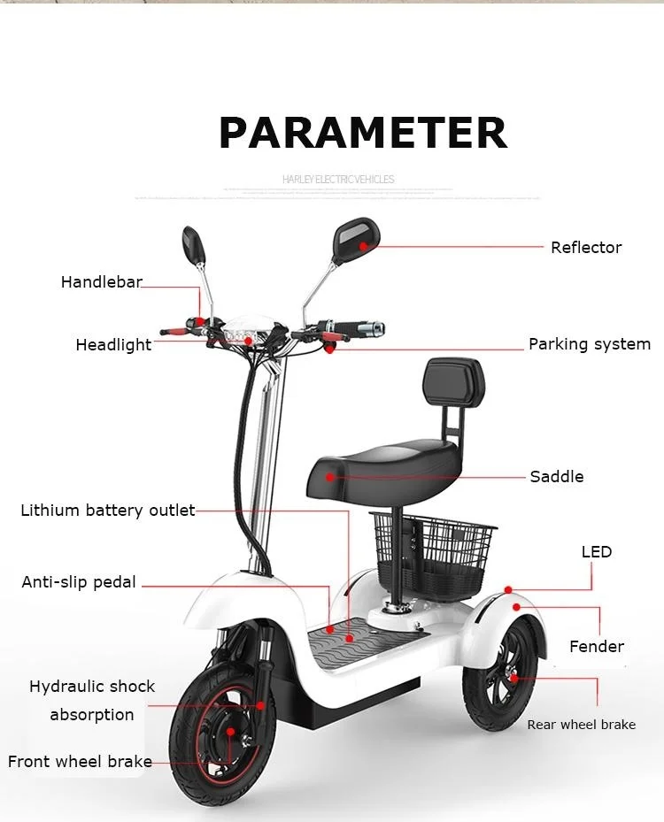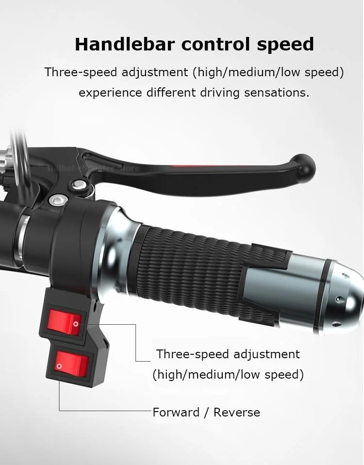 Особенность:Передняя и задняя Дисковая тормозная система, гидравлический амортизатор передней вилки, светодиодная фара, три скорости регулировки, функция обратного хода