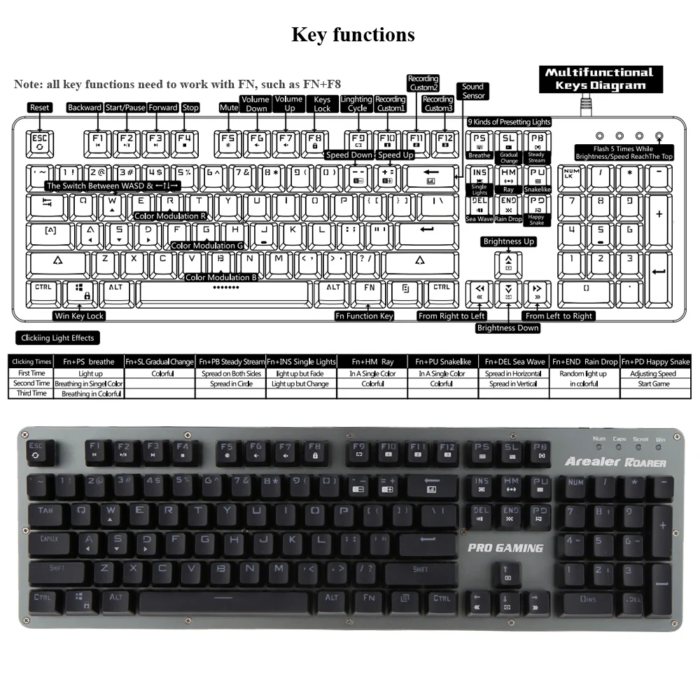 3 программируемые клавиши RGB: FN + F10,F11,F12 (нажмите первый раз: Отображает эффект освещения, который вы настроили, нажмите второй раз: мигание, запуск настройки, FN + R key/G key/B клавиша, чтобы изменить цвет программируемой клавиши, цвет которой будет таким же, как любой ключ, который вы нажимаете, чтобы настроить)