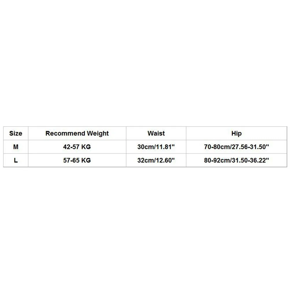 Размеры Настоятельно рекомендуем Вес Обхват талии Обхват бедер М 42-57 кг 30 см/11,81'' 70-80 см/27,56-31,50" L 57-65 кг 32 см/12,60'' 80-92 см/31,50-36,22"