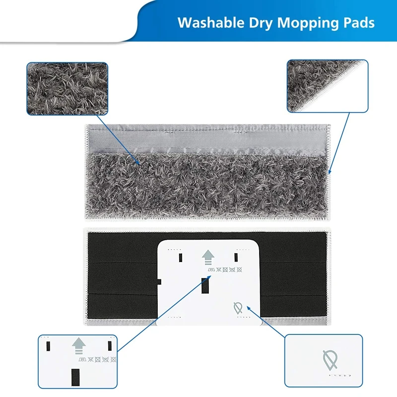 2. Моющаяся влажная моющая прокладка изготовлена из высококачественных впитывающих волокон для эффективной очистки и разбивает липкую грязь и кухонную смазку в режиме очистки пятен. Моющаяся сухая подметальная подкладка использует высококачественное миньфибер для захвата грязи, пыли и волос домашних животных.