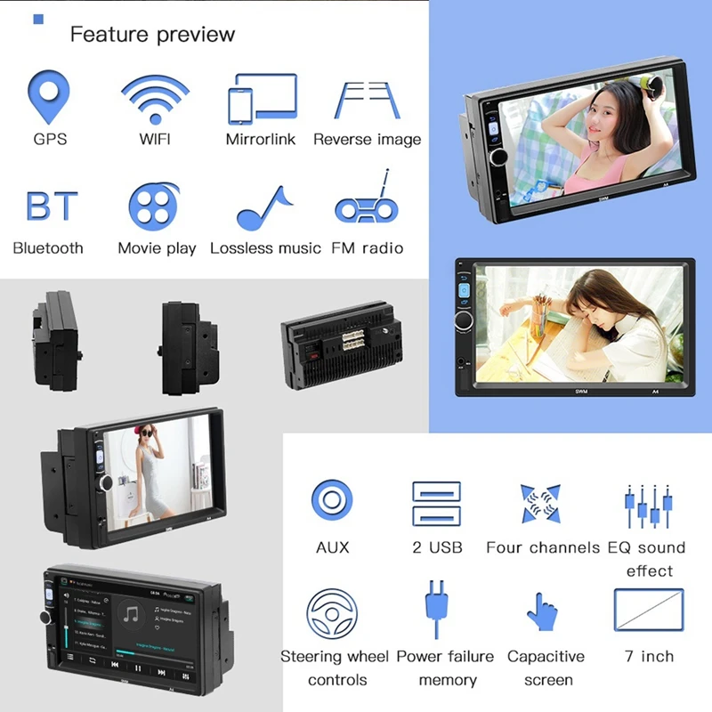 Din: Double Din; TF/Mini SD Slot: 0; Resolution: 1024 * 600; Max External Memory: other; Display Size: 7 inch ; Out Power: other; ROM: 16G; Model Name: A4 Car MP5 Player; Interface: USB AUX; Operating System: Android 8.1; RAM: 1G; Item Weight: 900g; Special Features: Bluetooth;Charger;FM Transmitter; Mobile Phone; MP3 Players; Radio Tuner; Contact Screen;Built-In Speaker/Microphone; Wifi Function; Support Steering Wheel Control; For Vehicle Brands/Model: universal