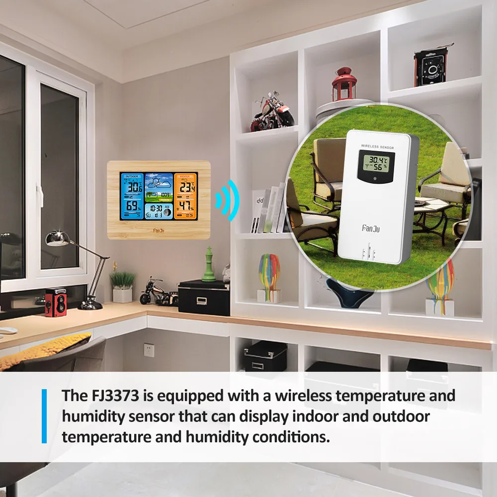 Более того, FJ3373 оснащен беспроводным датчиком температуры и влажности, который может отображать температуру в помещении и на улице, данные о влажности и барометрическое давление. Наружная высокая/низкая температура и мороз оповещения.