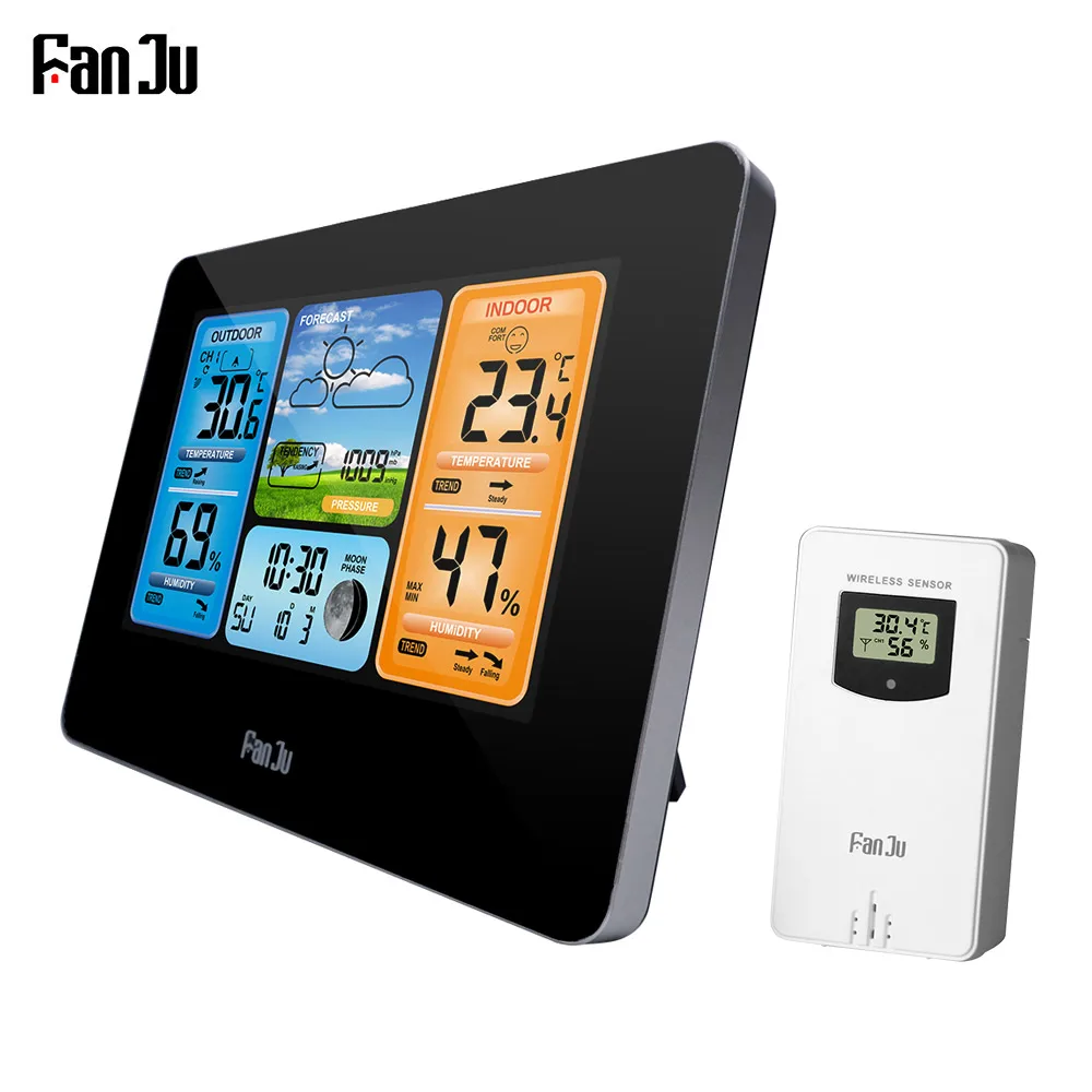 Многофункциональные цифровые часы FanJu FJ3373 могут отображать прогноз погоды, фазу Луны и обычные цифровые часы/календарь/будильник. Вечный календарь до 2099 года; День недели на 7 языках выбор пользователя: английский, немецкий, итальянский, французский, испанский, Нидерланды и Датский; Время в опциональном формате 12/24 часов.