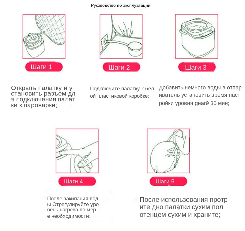 1 x парогенератор 1 x сауна-палатка 1 x коробка для трав 1 х пульт дистанционного Управление 2 х шланги 1 х разъем На английском языке (1 шт.) Instructios