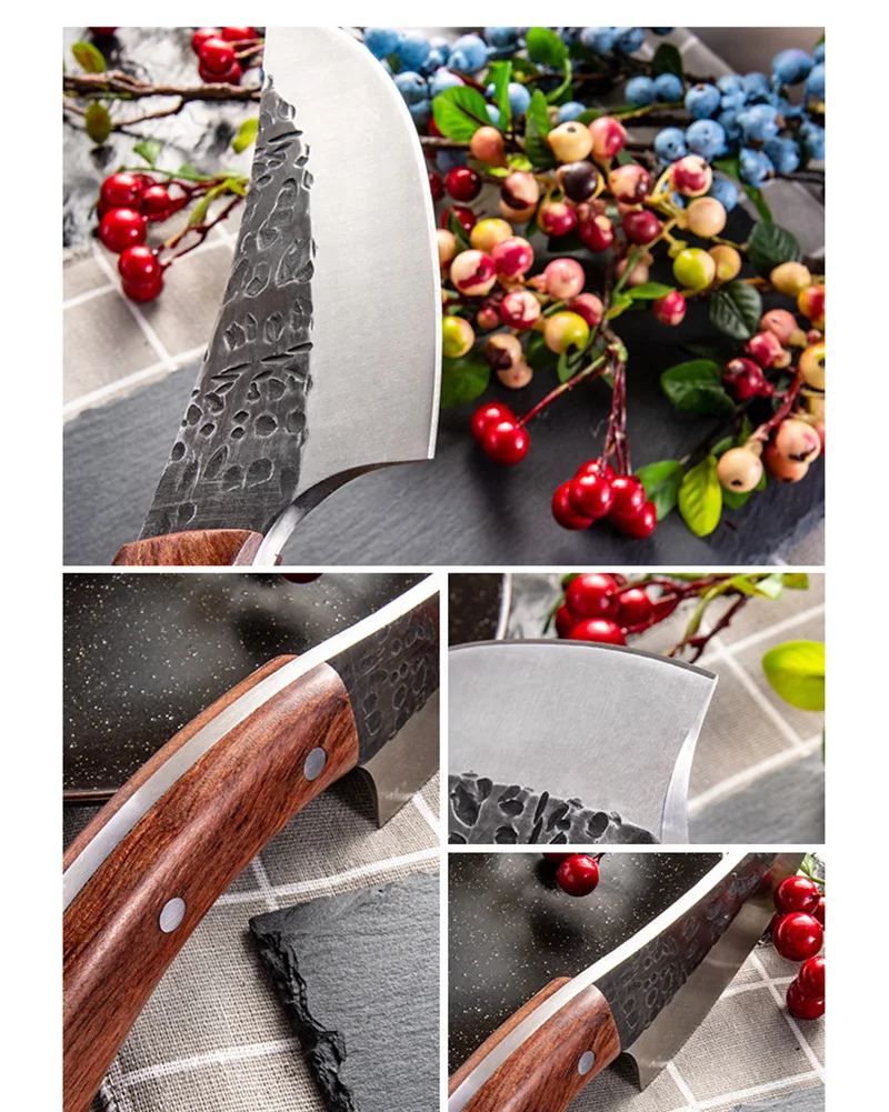Характеристики: Название продукта: нож шеф-повара ручной работы материал лезвия: Высокоуглеродистая сталь Материал ручки: нержавеющая сталь + дерево ремесло: традиционная кованая толщина обработки: 5 мм