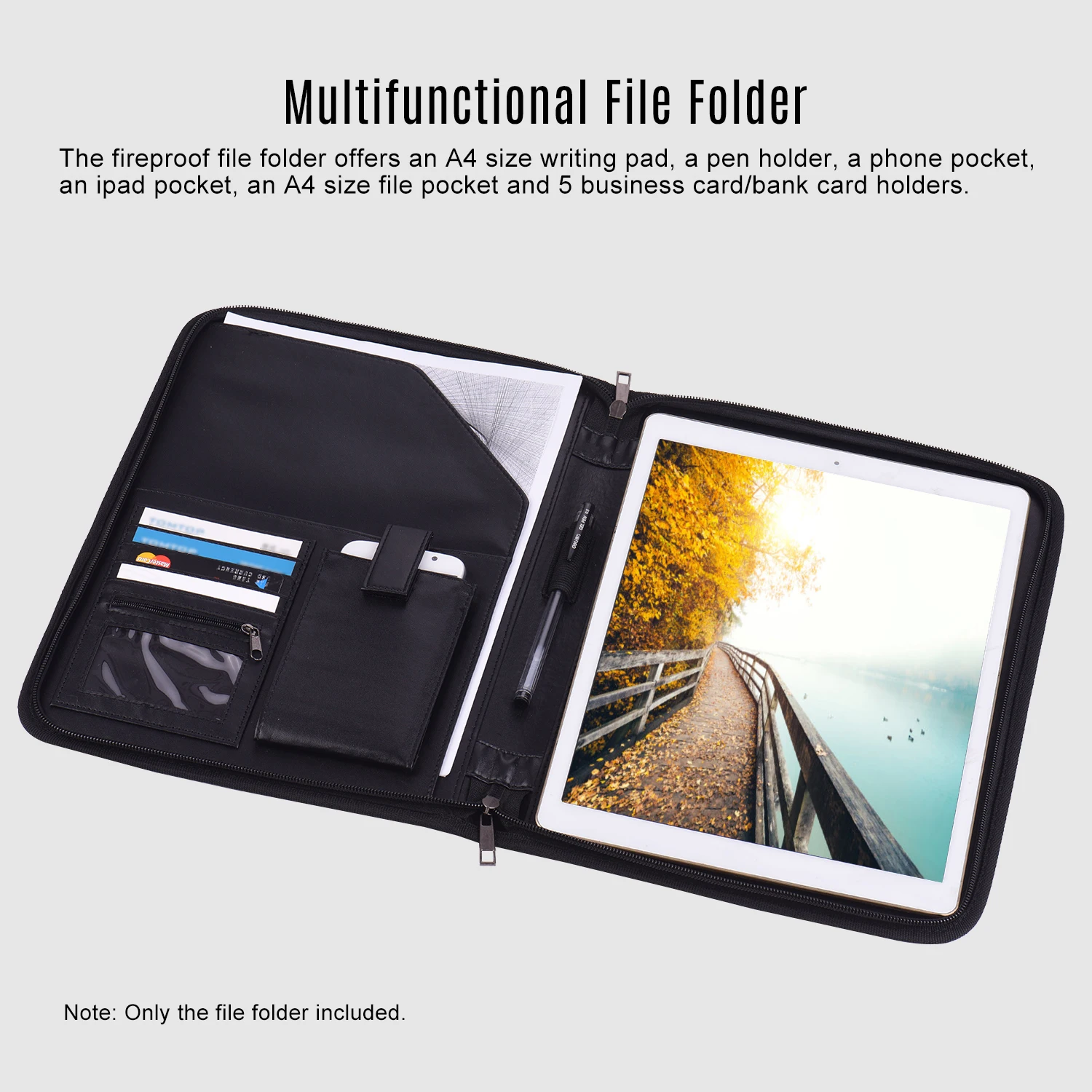 Многофункциональность: Огнеупорная папка для файлов имеет блокнот формата A4, держатель для ручек, карман для телефона, карман для ipad, карман для файлов формата A4 и 5 держателей для визиток/банковских карт.