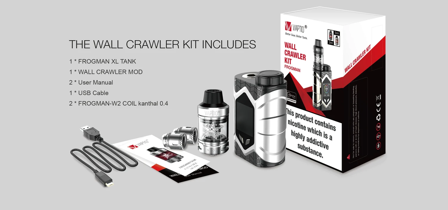 • 1 x настенный гусеничный мод Vaptio • Бак Vaptio Frogman (XL)-1 шт. • 2 катушки Frogman W2 0,4 Ом • 2 руководства пользователя • 1 usb-кабель