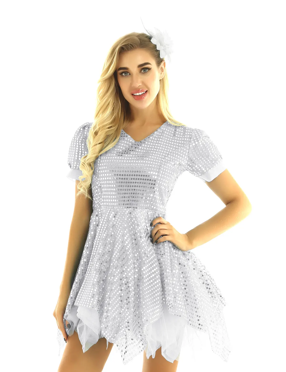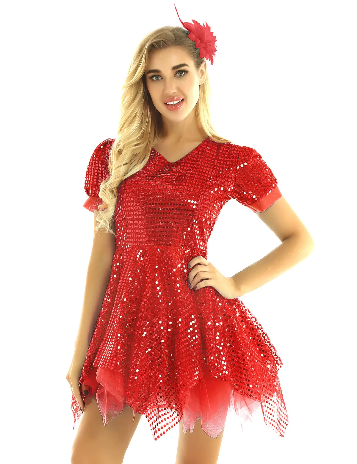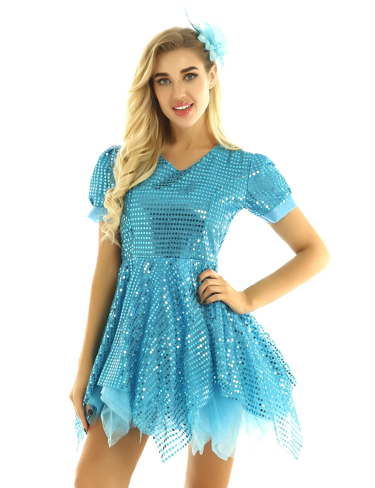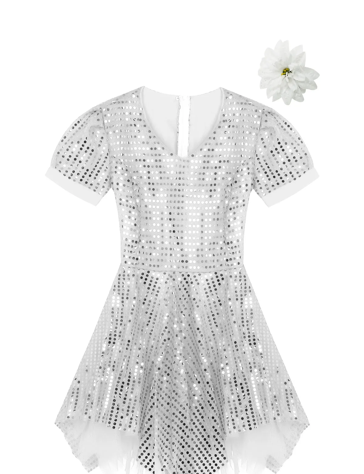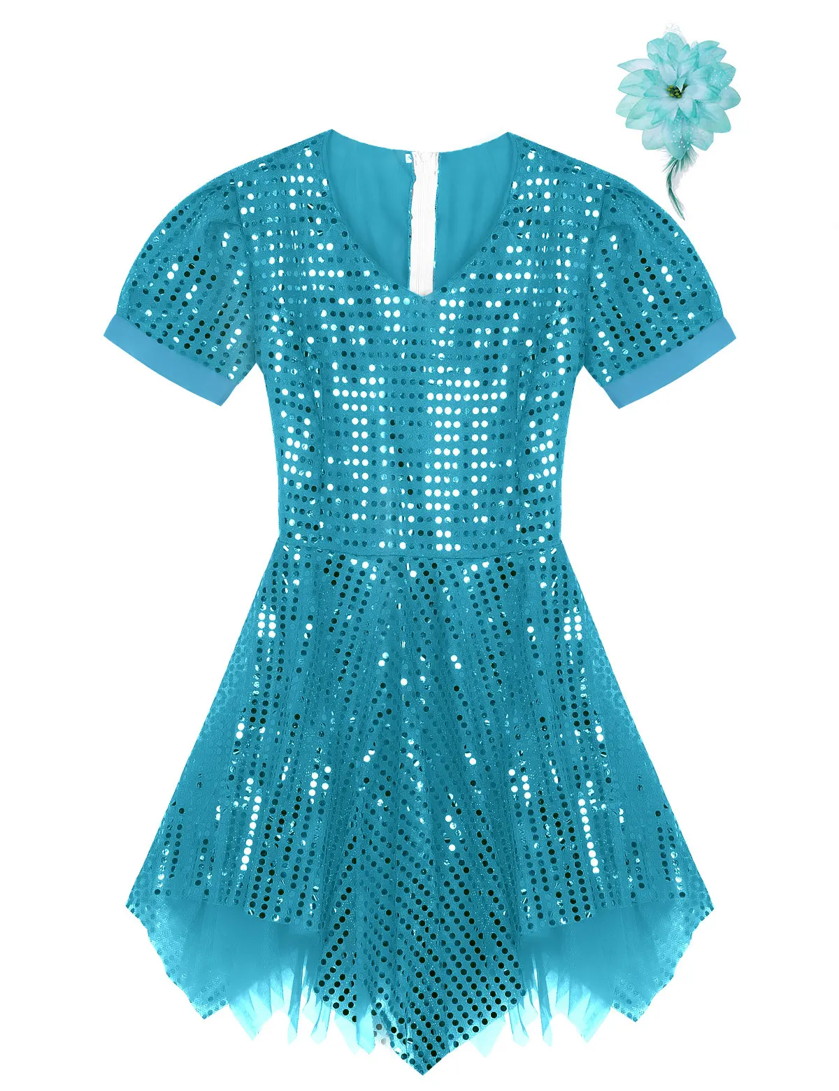 Женщины взрослые блестящие блестками Асимметричная сетка тюль танцевальное платье с заколка для волос в виде цветка набор, скрытая молния сзади закрытия.