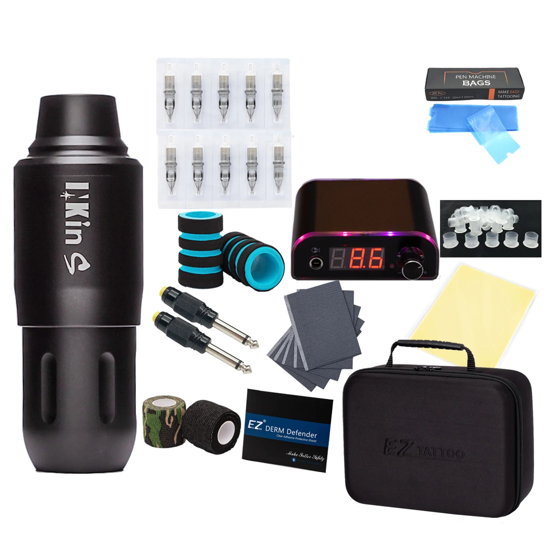 В комплект входит: EZ INKin S ручка тату машина: 1 шт Эз мини тату Источник питания: 1 шт. Чашки для чернил 10 мм: 50 шт. ЭЗ пены памяти крышки: 2 шт Искусственная кожа: 15*10 см: 1 шт. Крышка ручки: 200 шт. Защитная пленка EZ Derm: 5 листов Бандажный чехол с зажимом: 2 шт. EZ Revolution картриджи: 10 шт. Чистящие салфетки: 5 шт. Беспроводная ножная педаль: 2 шт. Упаковочная коробка: черный чехол EZ