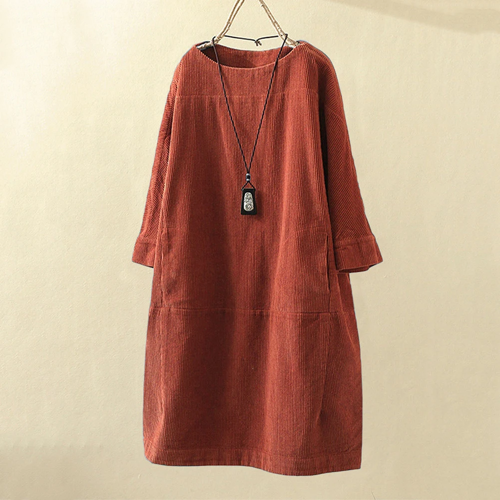 Женское однотонное вельветовое платье миди с длинным рукавом и круглым вырезом, карманами, размера плюс