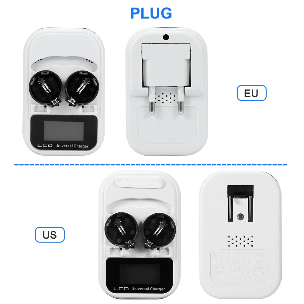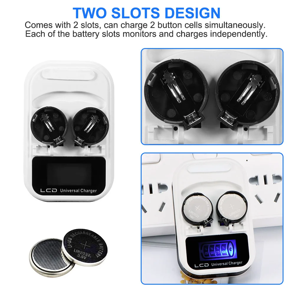 Поставляется с 2 слотами, может заряжать 2 кнопочные ячейки одновременно. Каждый из слотов аккумулятора контролирует и заряжает самостоятельно.