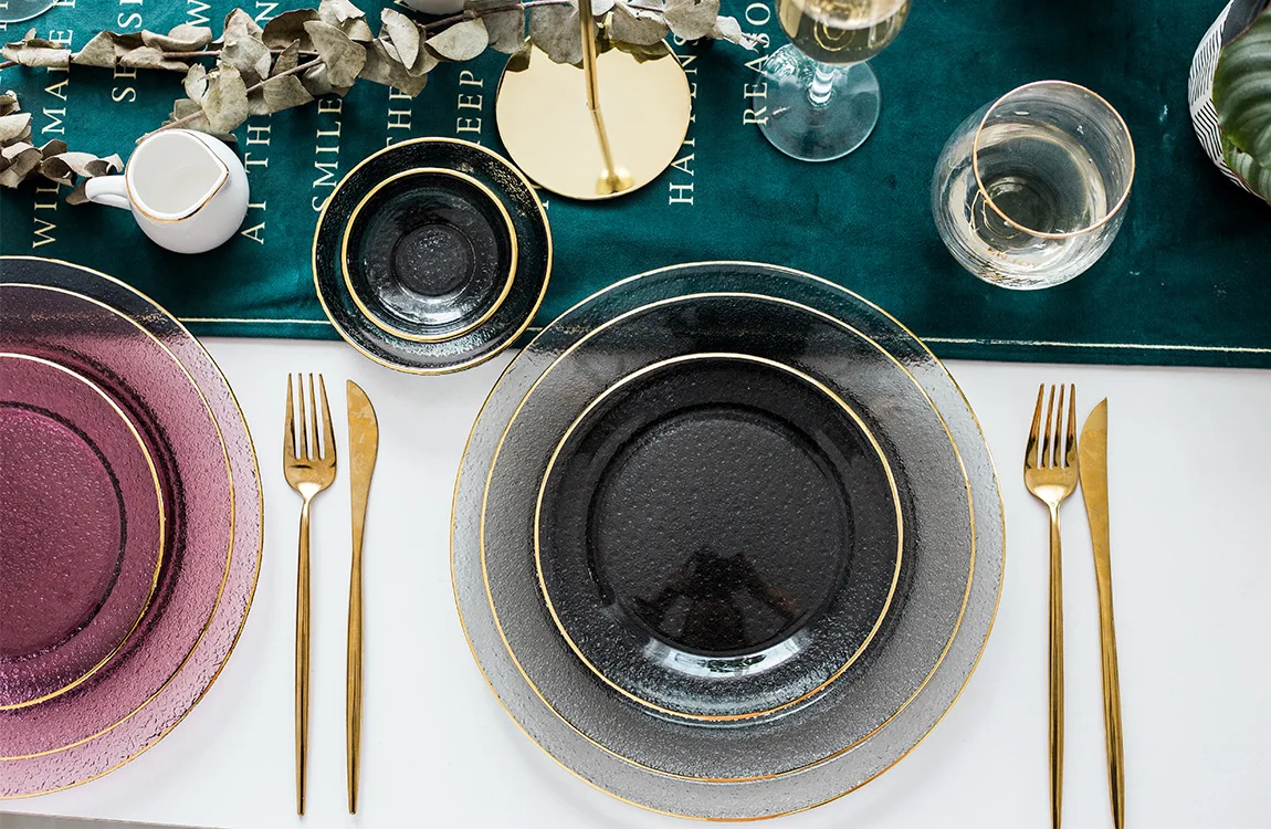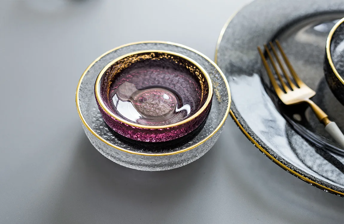 Материал: газированное известковое стекло Процесс: ручная работа, нарисованный вручную золотой Цвет: прозрачный, пепельно-серый, винно-красный
