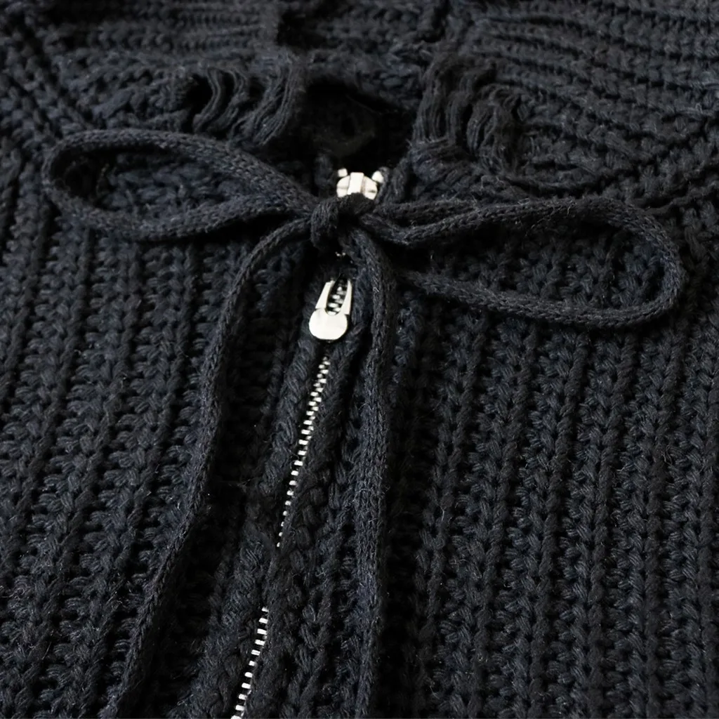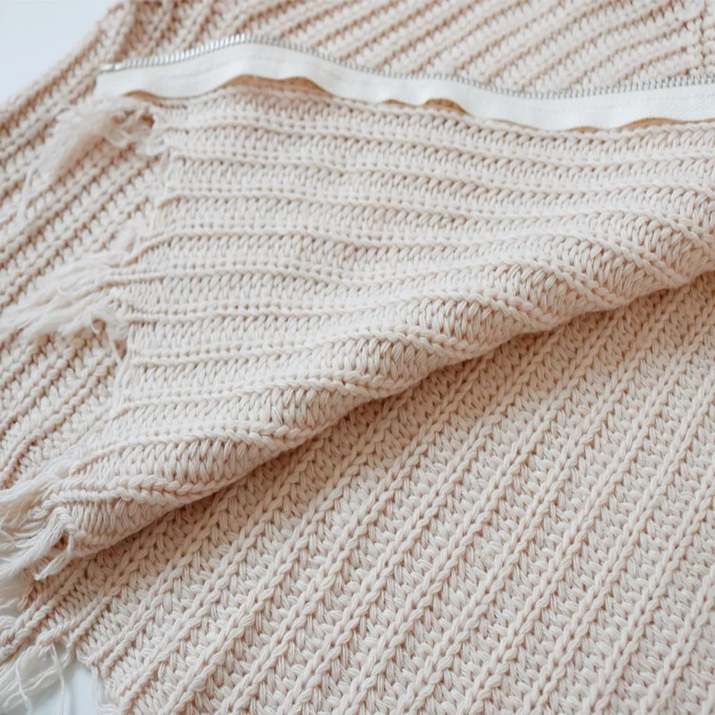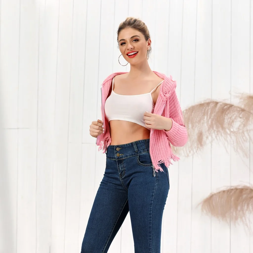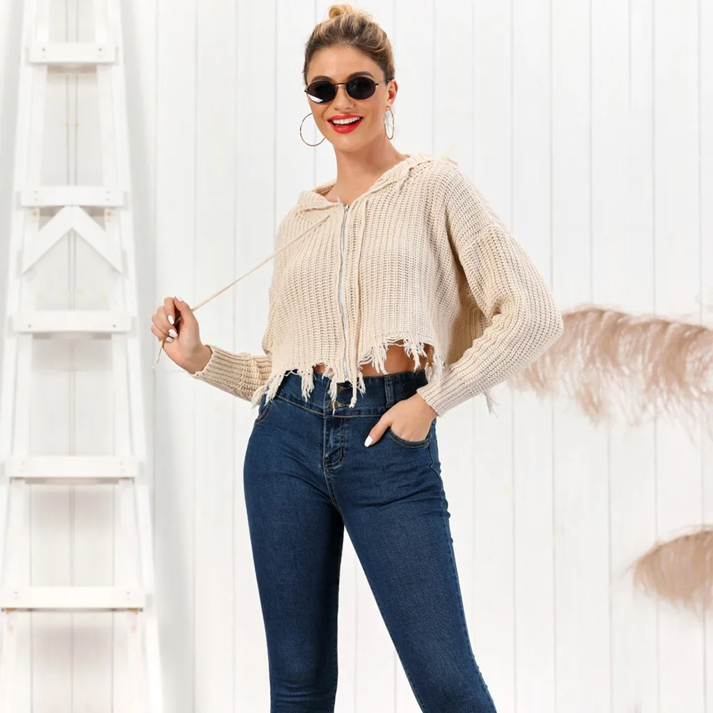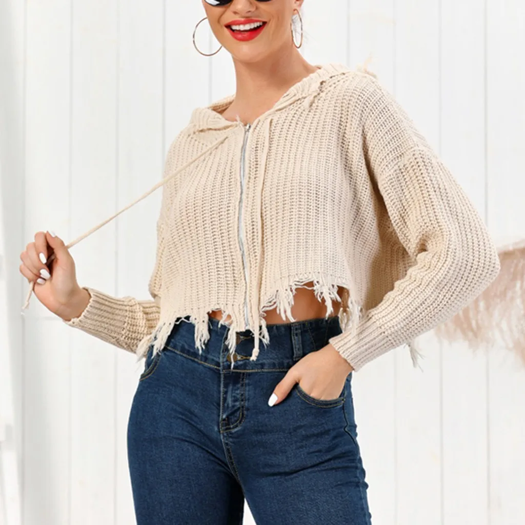 Новые женские вязаные свитера на молнии с v-образным вырезом и длинным рукавом, верхняя одежда с капюшоном и кисточками