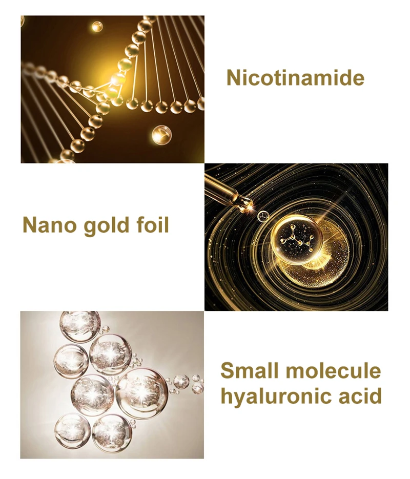 Никотинамид, золото 24 карата, шесть пептидов, гиалуронат натрия, токоферол, H