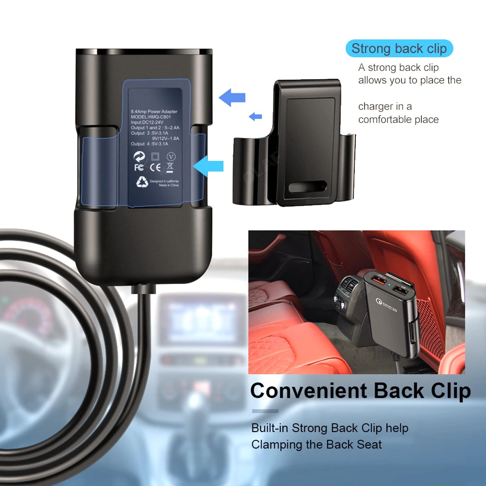 2. Переднее и заднее автомобильное зарядное устройство: Встроенный задний зажим помогает плотно прикрепить заднее сиденье.