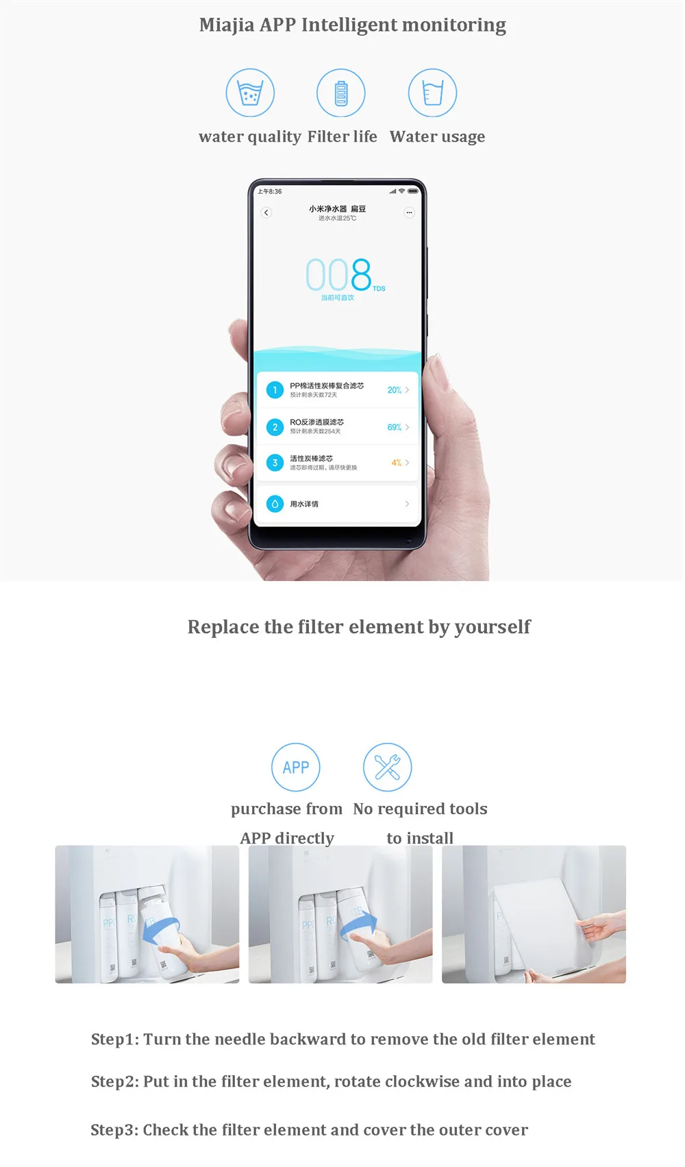 -Интеллектуальный интеллектуальный мониторинг приложения Mijia, вы можете проверить срок службы фильтра в любое время.