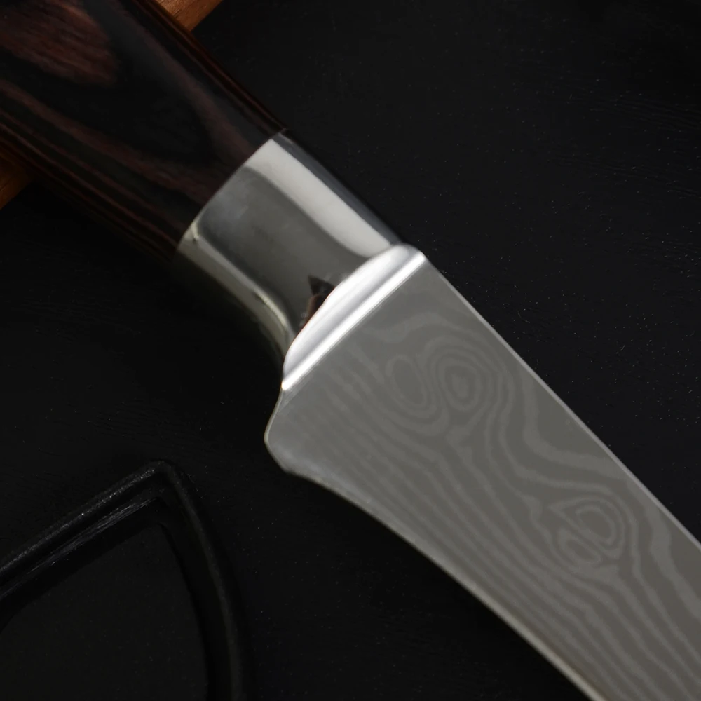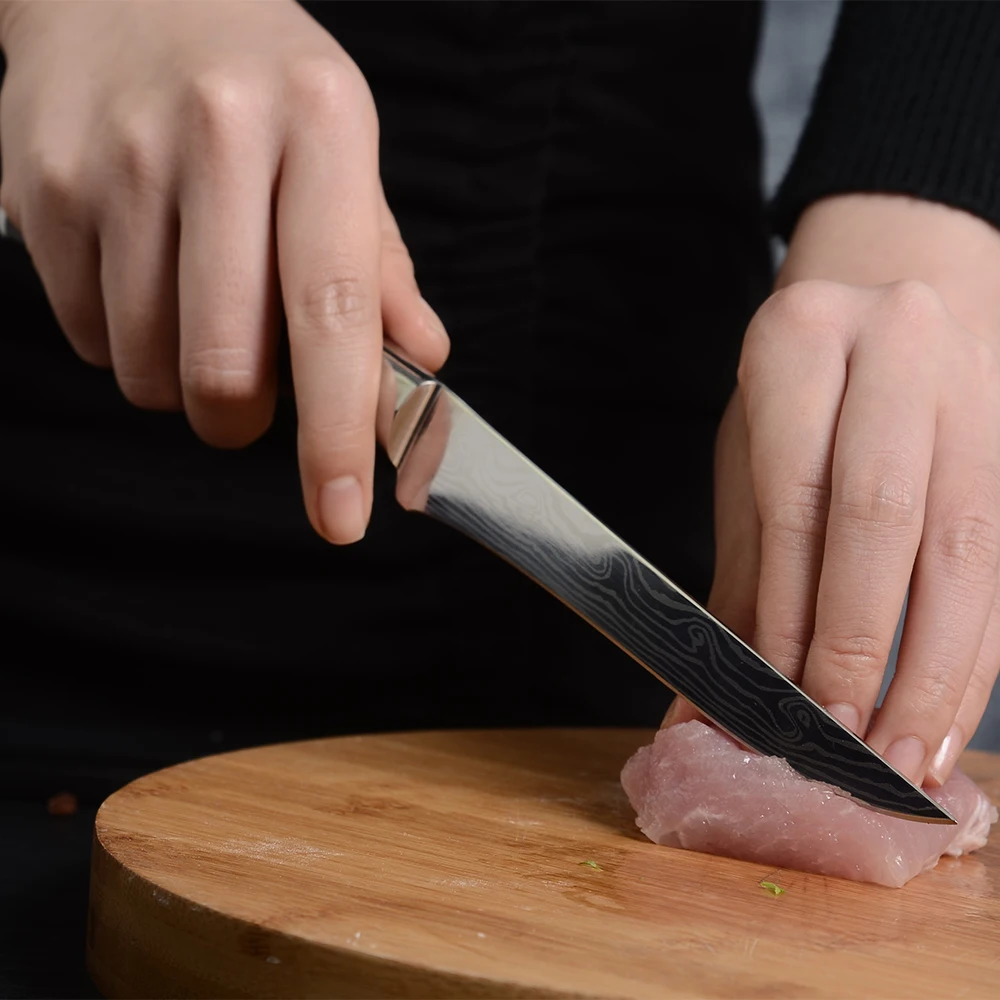 5,5 дюймов нож обвалочный Ножи изготовлено из высокоуглеродистой Пособия по немецкому языку из нержавеющей стали для того чтобы обеспечить максимальную четкость, удержание кромки и устойчивость к коррозии. Правильно сбалансированный, чтобы обеспечить точное приближение к кости нарезки