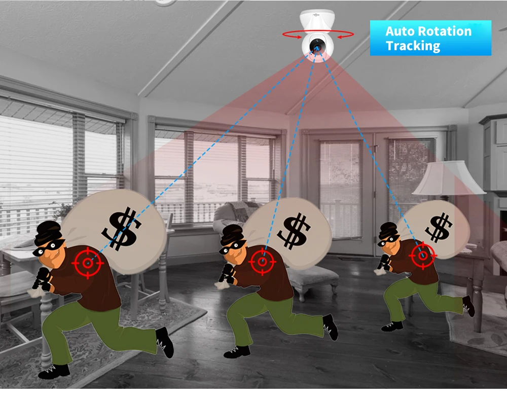 • Интеллектуальная автоматическая дорожка движения: при обнаружении действия камера отправит приложение в режиме реального времени сообщение и электронное письмо и забудет его на SD-карте