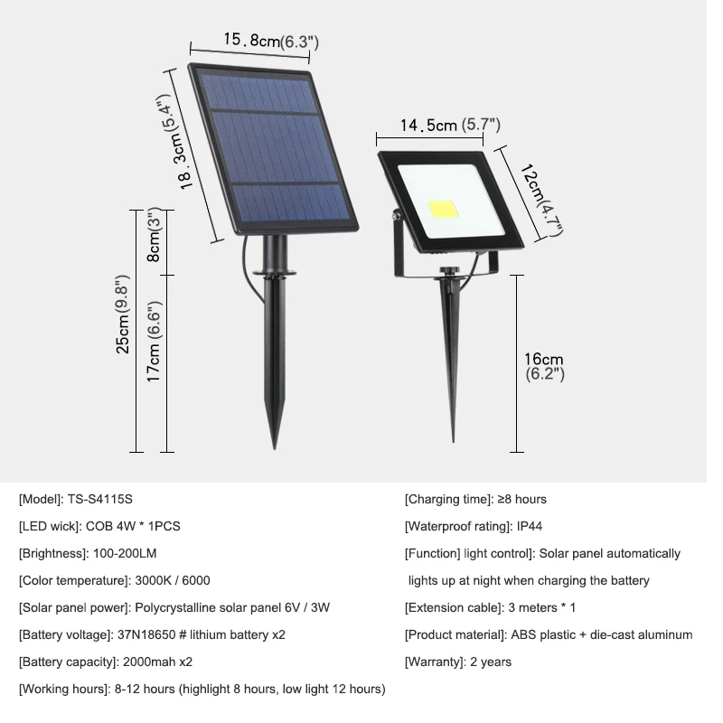 [Светодиодный фитиль]: Cob 4 Вт * 1 шт. [Яркость]: 100-200 лм [Цветовая температура]: 3 000k / 6000k [Панели солнечные Мощность]: поликристаллический кремний Панели солнечные 6v / 3w [Батарея Напряжение]: 3,7 v 18650 # литиевая Батарея X2 [Емкость аккумулятора]: 2000 мАч X2 [Рабочее время]: 8-12 часов (высокий светильник 8 часов, низкий светильник 12 часов) [Время зарядки]: ≥ 8 часов [Водонепроницаемость]: Ip44 [Функция]: светильник управляется, солнечная панель заряжает батарею в течение дня, и автоматически светильник включается ночью [Удлинительный кабель]: 3 метра * 1 [Материал изделия]: АБС-пластик + литой алюминий [Гарантия]: 3 года