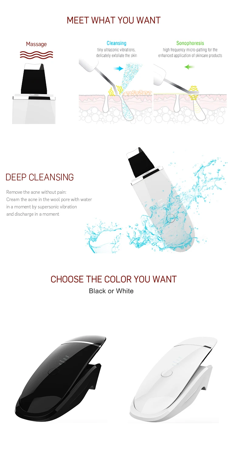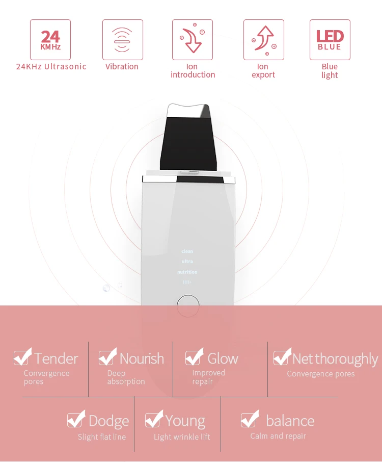 Продукт использует ультразвуковую импульсную технологию. Ультразвуковая вибрация может восстановить чистую и прозрачную кожу. Высокая Ультразвуковая частота может распылять грязь пор и удалять грязь из пор жидкими средами. Под действием ультразвуковых и отрицательных ионов эссенция переносится в нижний слой кожи для ускорения поглощения кожи. Продукт